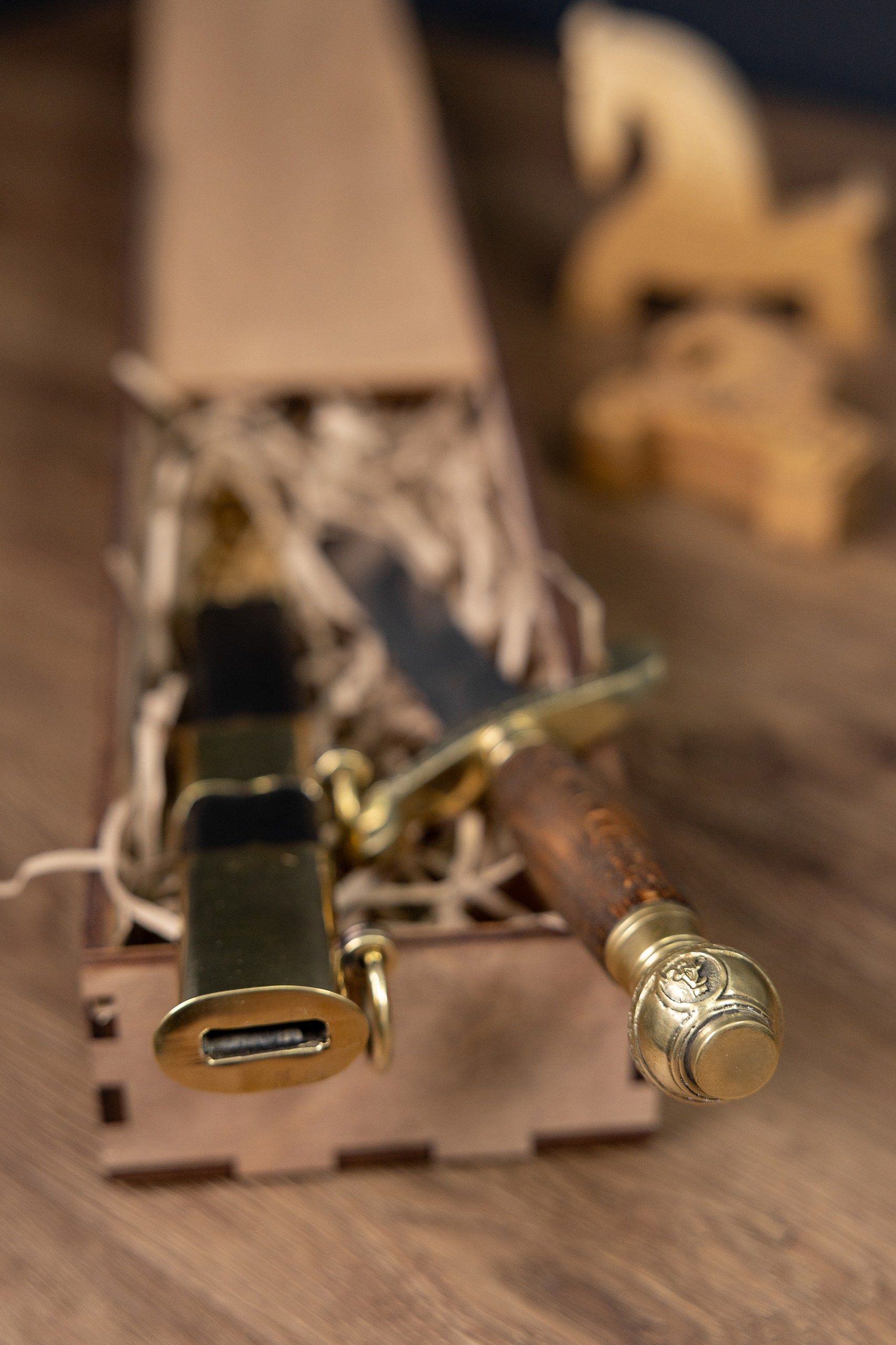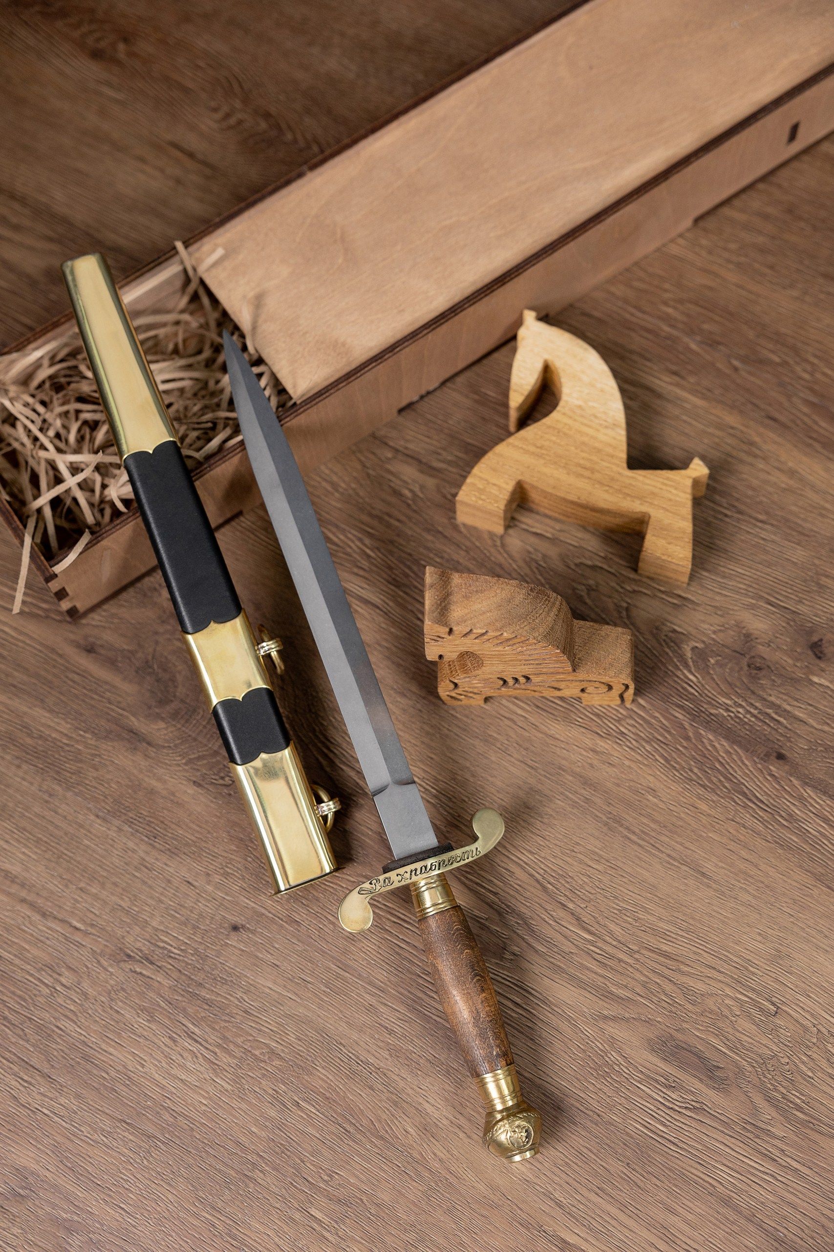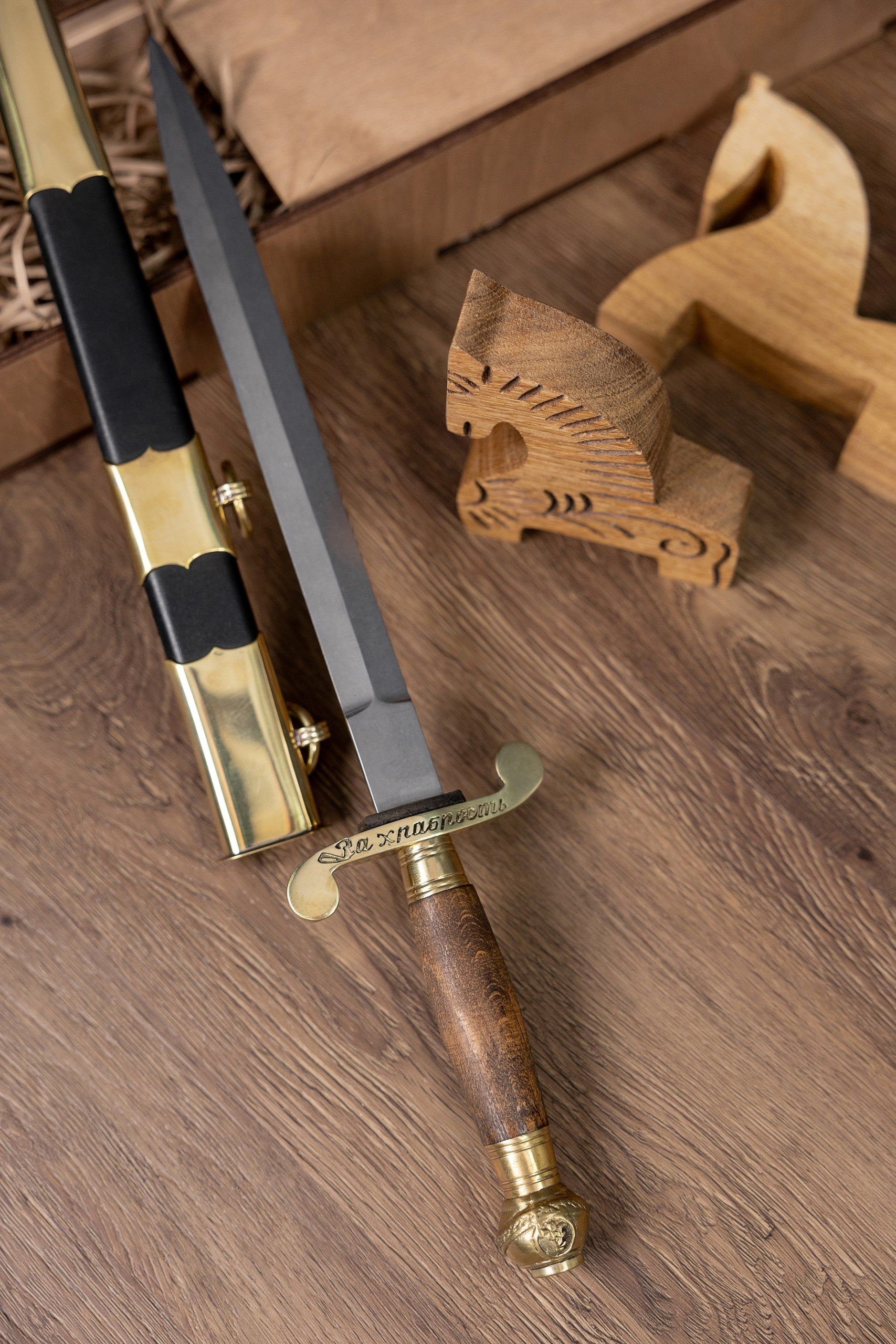 Клинок кованый, из высокоуглеродистой стали, обоюдоострый, сечение клинка ромбовидное. Кромки клинка подведены под заточку, хвостовик клинка цельнокованный, проходит сквозь всю рукоять. Закалка клинка зонная, твёрдость увеличивается от рукояти к концу. Рукоять изготовлена из латуни, гарда украшена надписью "За храбрость!", черен выполнен из массива берёзы. Ножны деревянные, обтянуты натуральной кожей и украшены латунными колпаками. Упаковывается в защитный кожаный чехол из винилискожи, в комплект также входит сертификат на изделие.