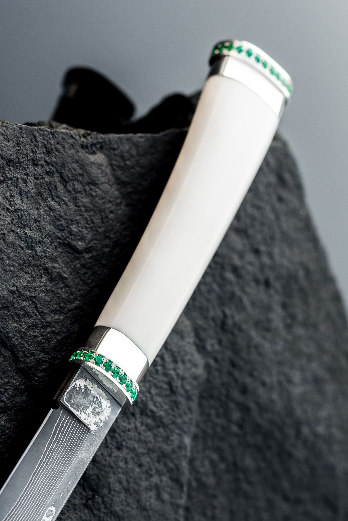 Рукоять: клык (бивень) моржа, больстер выполнен из серебра, инкрустирован гидротермальными изумрудами, навершие - из серебра, инкрустировано гидротермальными изумрудами.