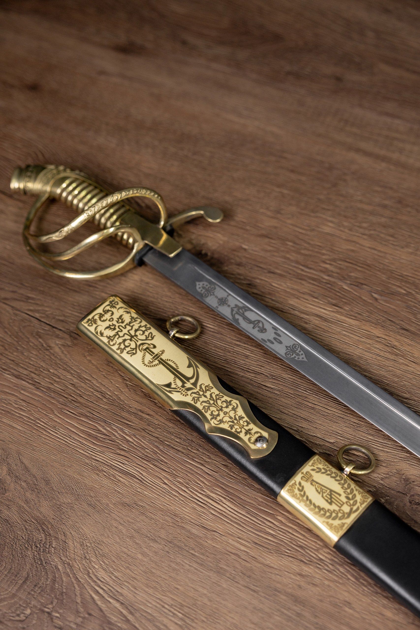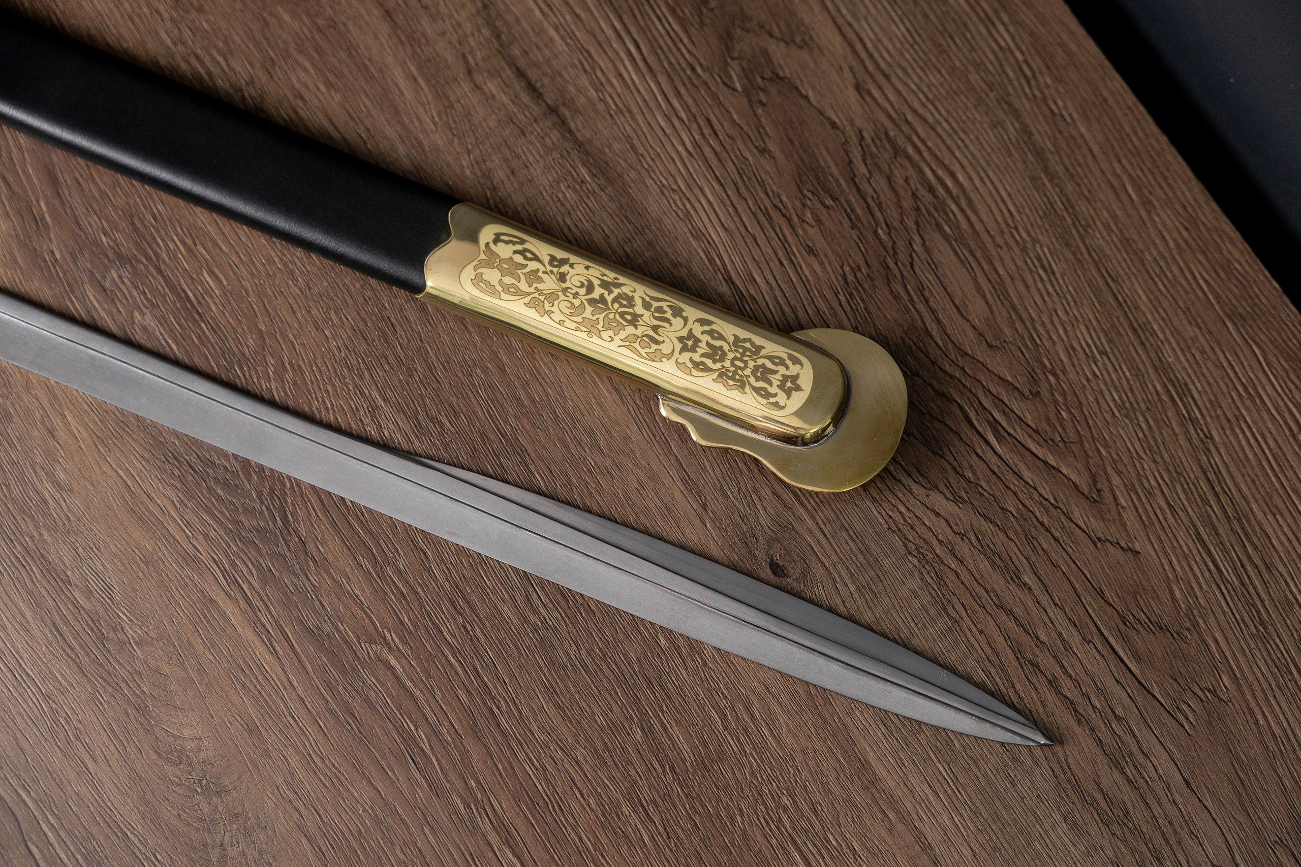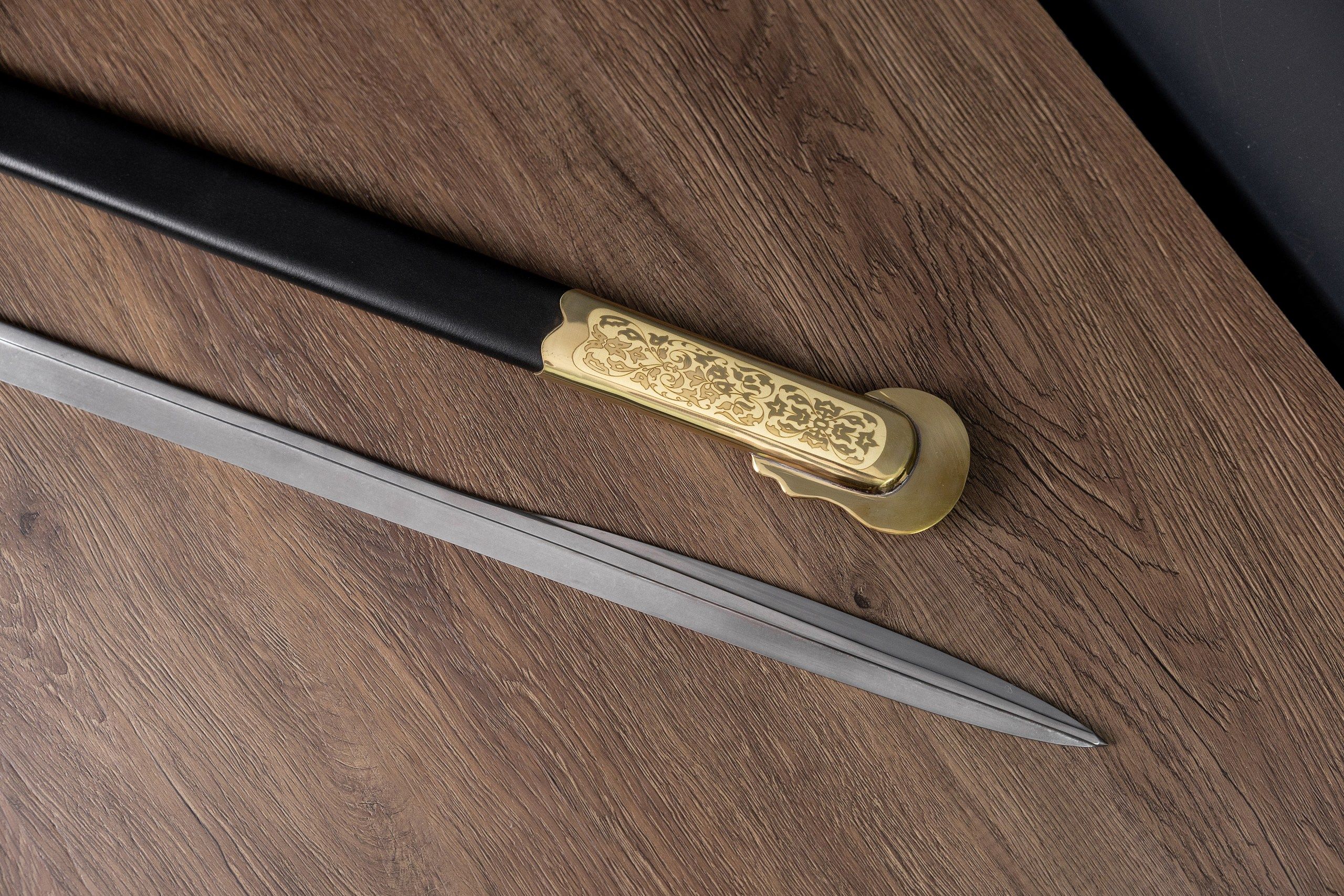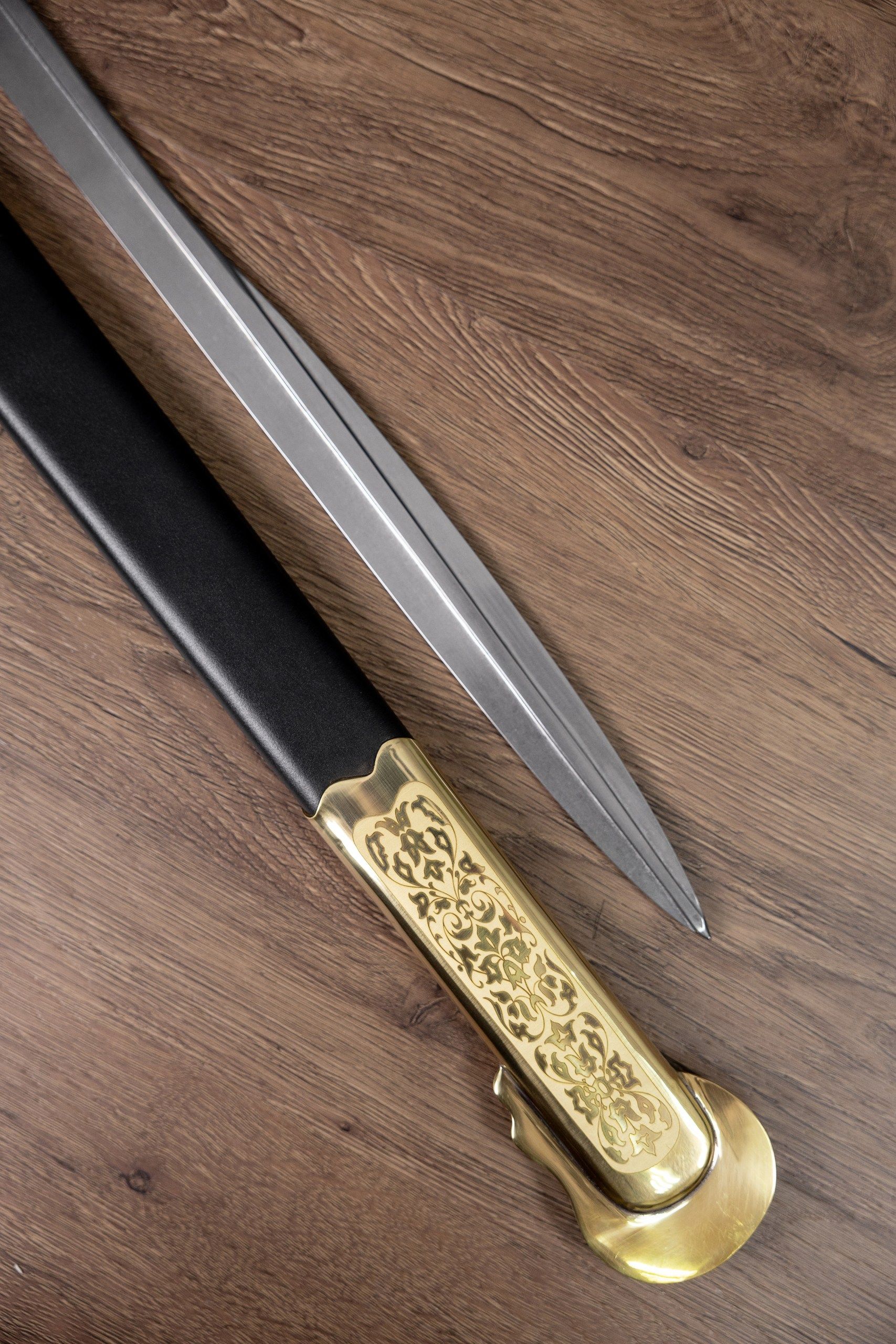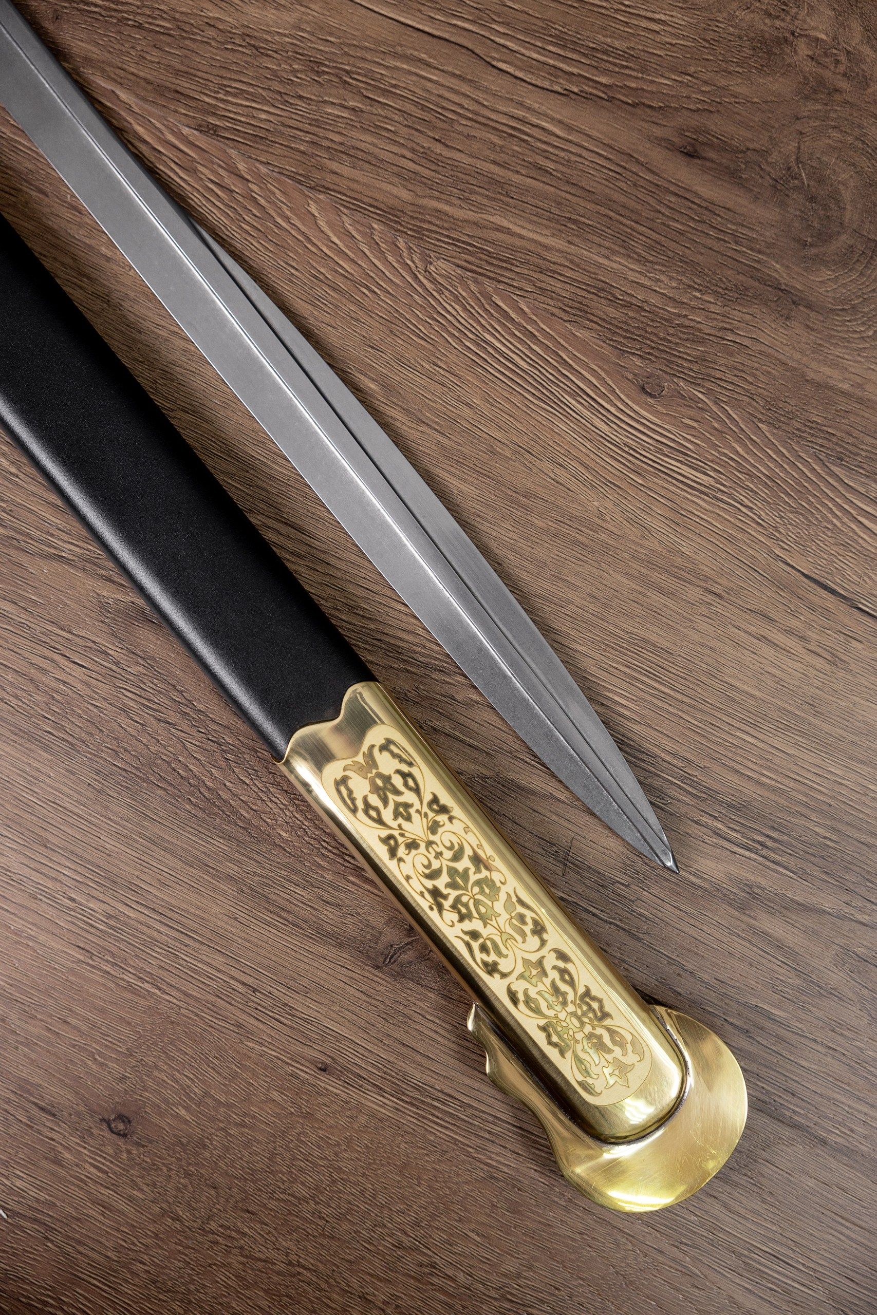 Клинок кованый, из высокопрочной углеродистой стали 65г, хвостовик клинка цельнокованый, полностью уходит в рукоять, без подпилов, кромка клинка подведена под заточку. Клинок не содержит дола, на верхней части клинка имеется утолщение, к концу клинок имеет расширение. На клинке методом химического травления нанесён тематический узор. Рукоять полностью латунная. Ножны изготовлены из дерева хвойных пород, обтянуты натуральной кожей, украшены латунными колпаками с узором. Для защиты от воздействия внешней среды палаш упаковывается в чехол из винилискожи. В комплект входит сертификат.