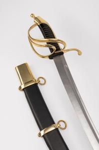 Сабля кавалерийская офицерская образца 1827 года. На протяжение XIX века, на вооружение русской армии последовательно принимали целый ряд образцов кавалерийских и пехотных сабель. Образец сабли 1827 года заменил в войсках саблю образца 1817 года. Отличительной особенностью от предшественника стал широкий двулезвийный конец клинка. У офицерских тсабель допускалась установка произвольных клинков, в том числе и иностранного производства. На верхней части латунной планки, покрывающей спинку рукояти, изображался растительный орнамент и вензель Императора в царствование которого офицер получил свой первый чин.
