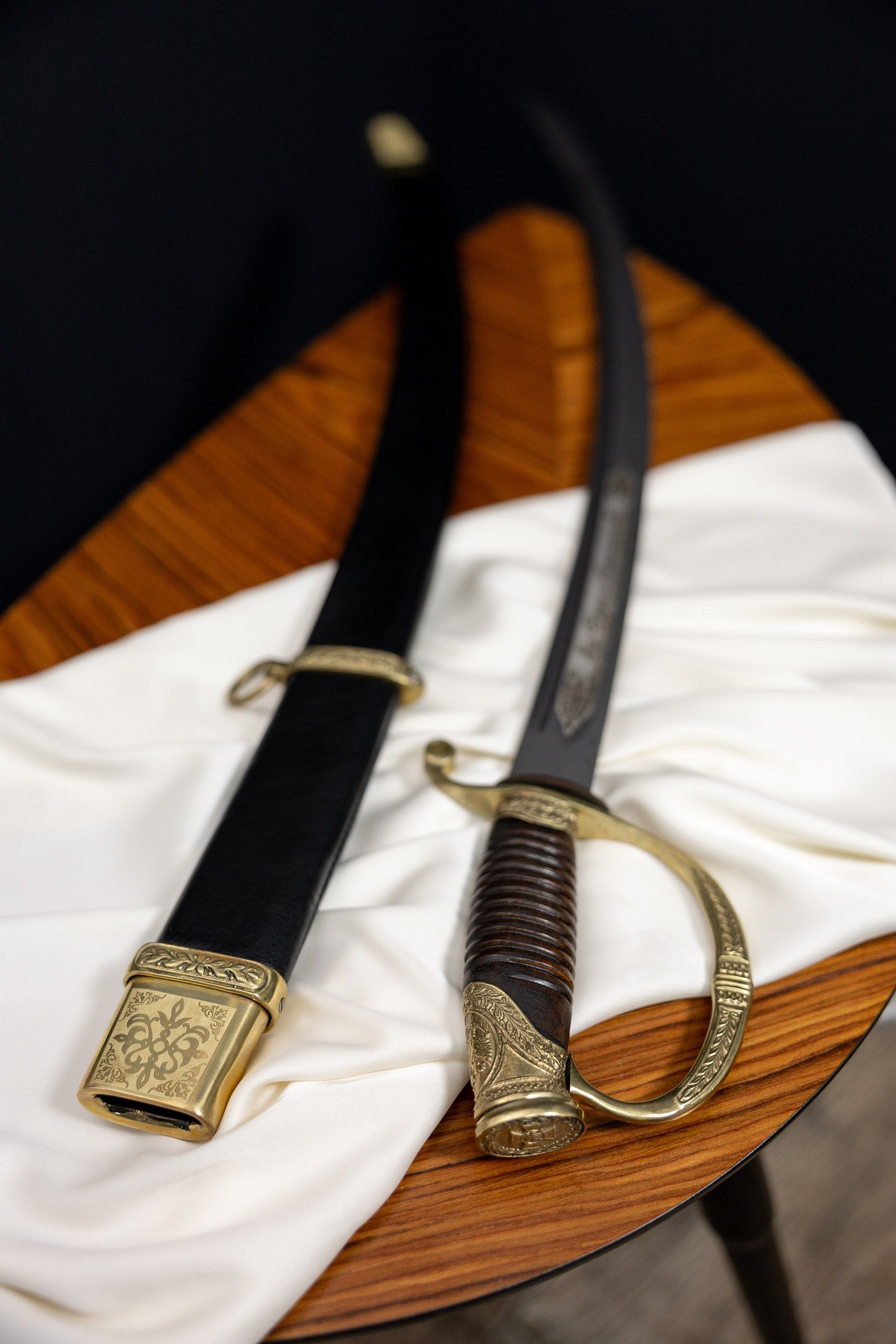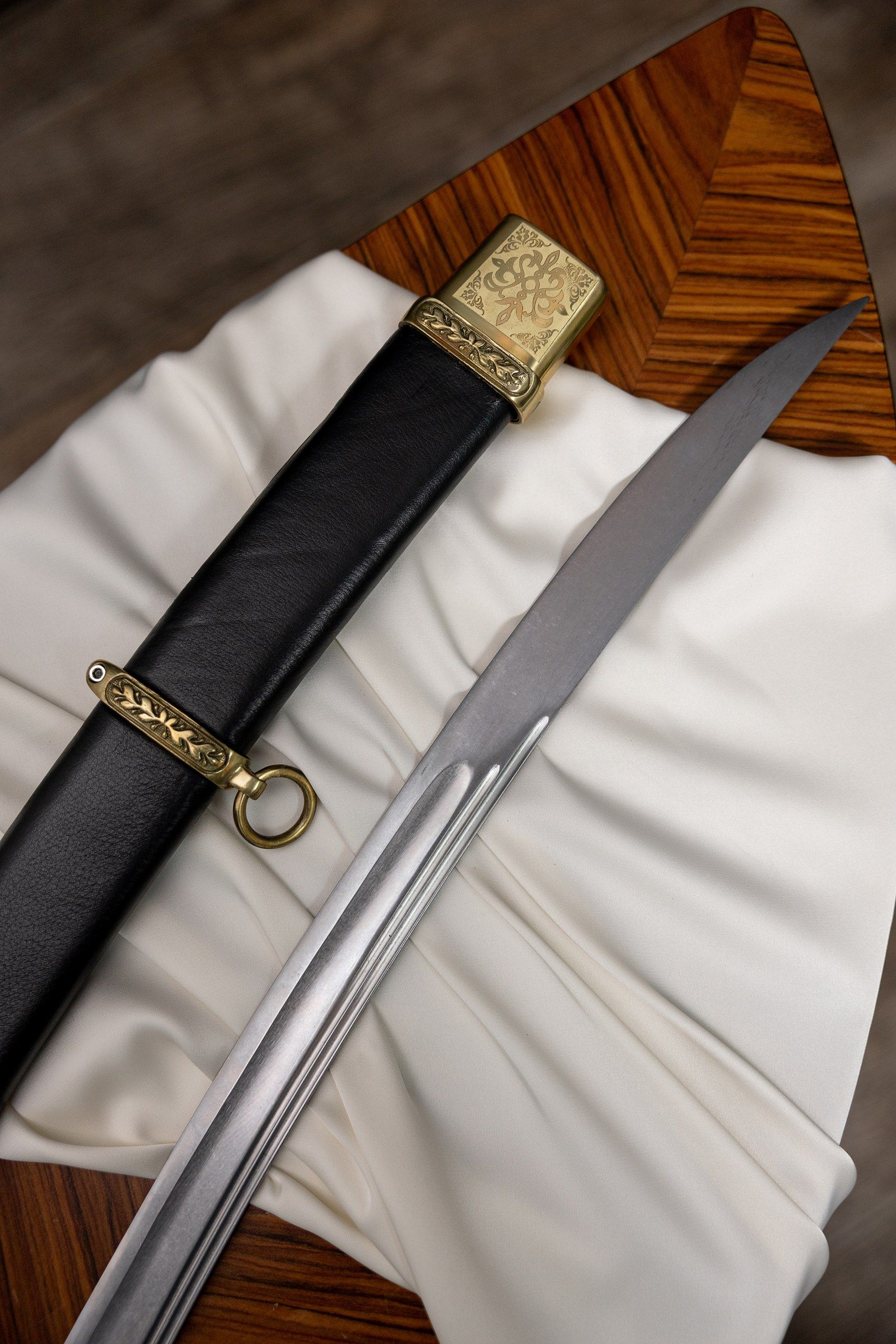 Клинок: искривленный, кованый, содержит два узких дола и один широкий, сталь 65г - высокоуглеродистая, пружинная. Кромка клинка подведена под заточку. Хвостовик клинка цельнокованый, не содержит подпилов, проходит сквозь всю рукоять. Рукоять имеет гарду в виде скобы соединяющую оба конца рукояти, изготовлена из латуни, черен выполнен из массива березы и имеет вертикальные насечки; ножны производятся из массива хвойного дерева, обтянуты натуральной кожей, прибор ножен латунный. Упаковывается в кожаный чехол (винилискожа). В комплект также входит сертификат на изделие и оружейное масло по уходу за клинком.