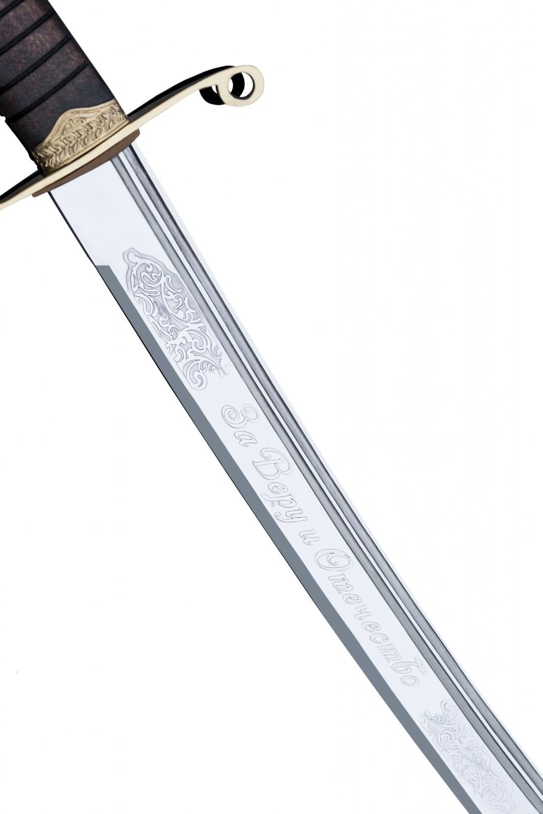 Клинок кованый, изготовлен из высокоуглеродистой пружинной стали 65г, подведён под заточку, не содержит никаких послаблений в конструкции. На клинке методом химического травления нанесён узор и надпись "Честь, долг, Отвага " с одной стороны и "За Веру и Отечество"- с другой. Рукоять латунная, с фигурной гардой, черен выполнен из берёзы с продольными желобками. Ножны изготовлены из хвойных пород, обтянуты натуральной кожей. Ножны украшены латунным колпаком с резьбой. Поставляется сабля в чехле из винилискожи, в комплект также входит сертификат соответствия.