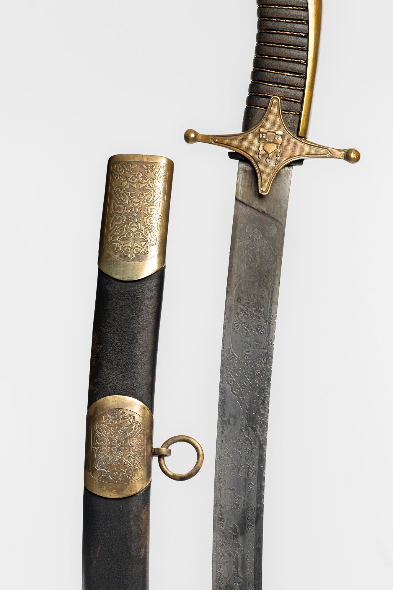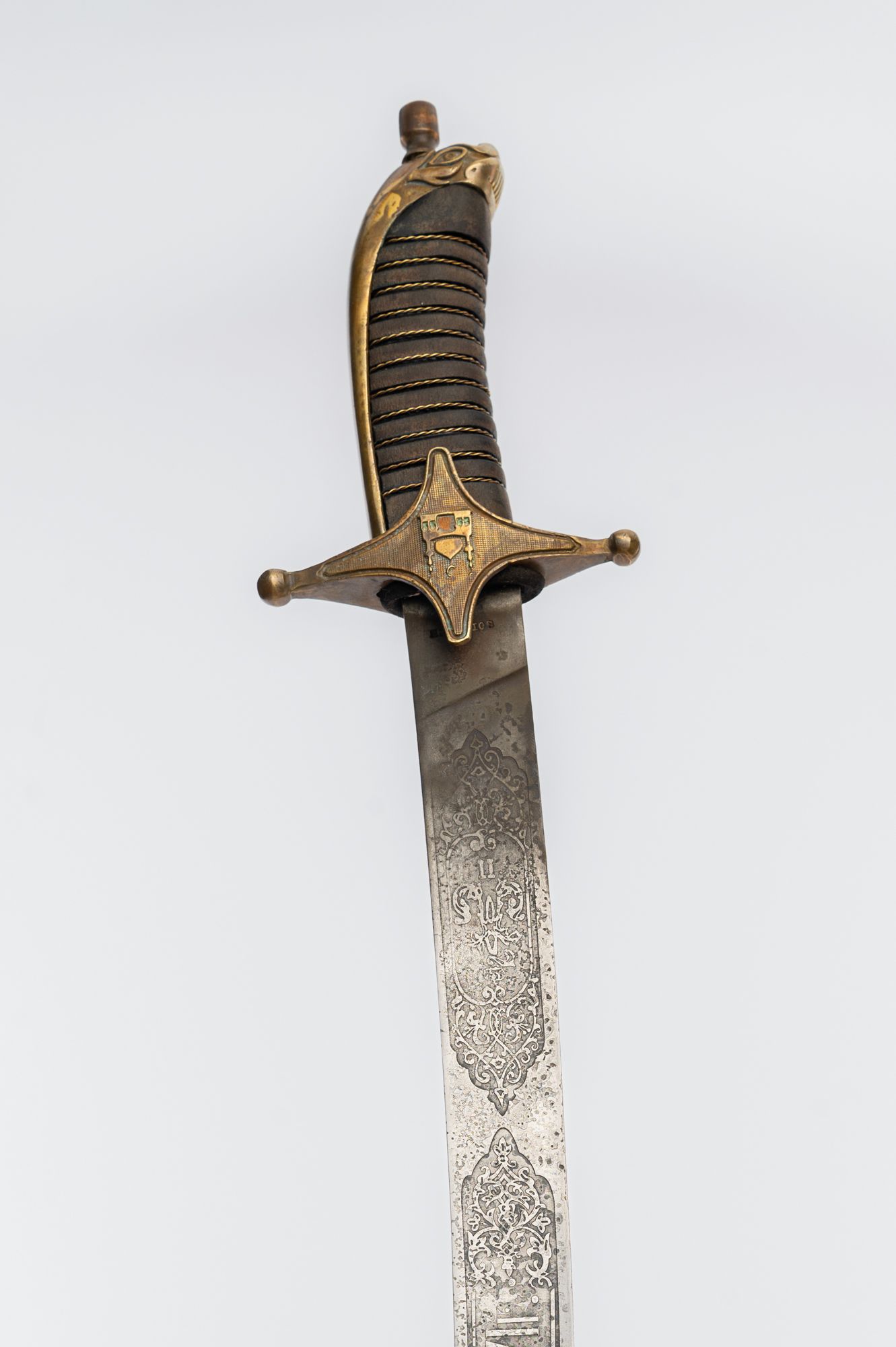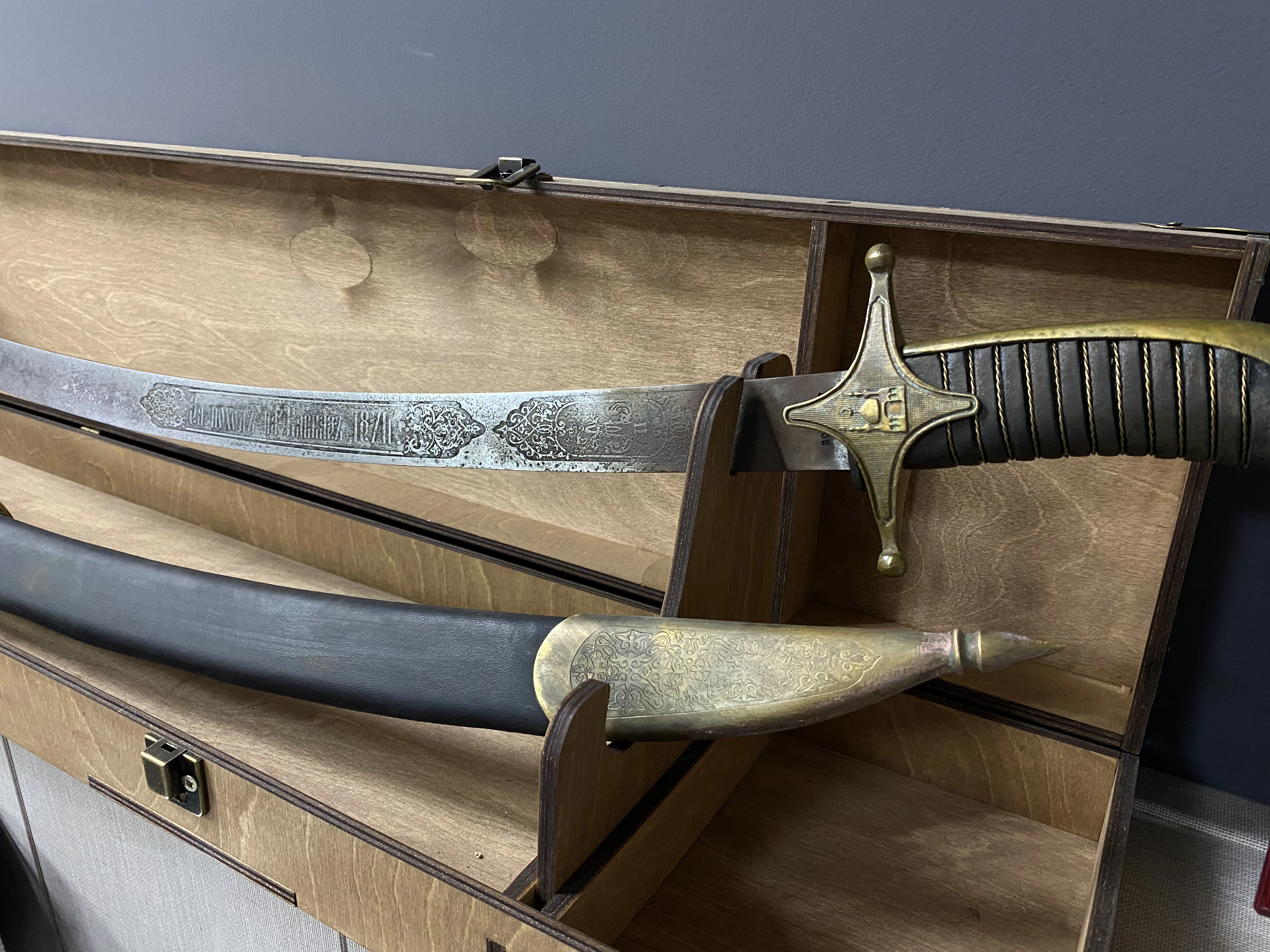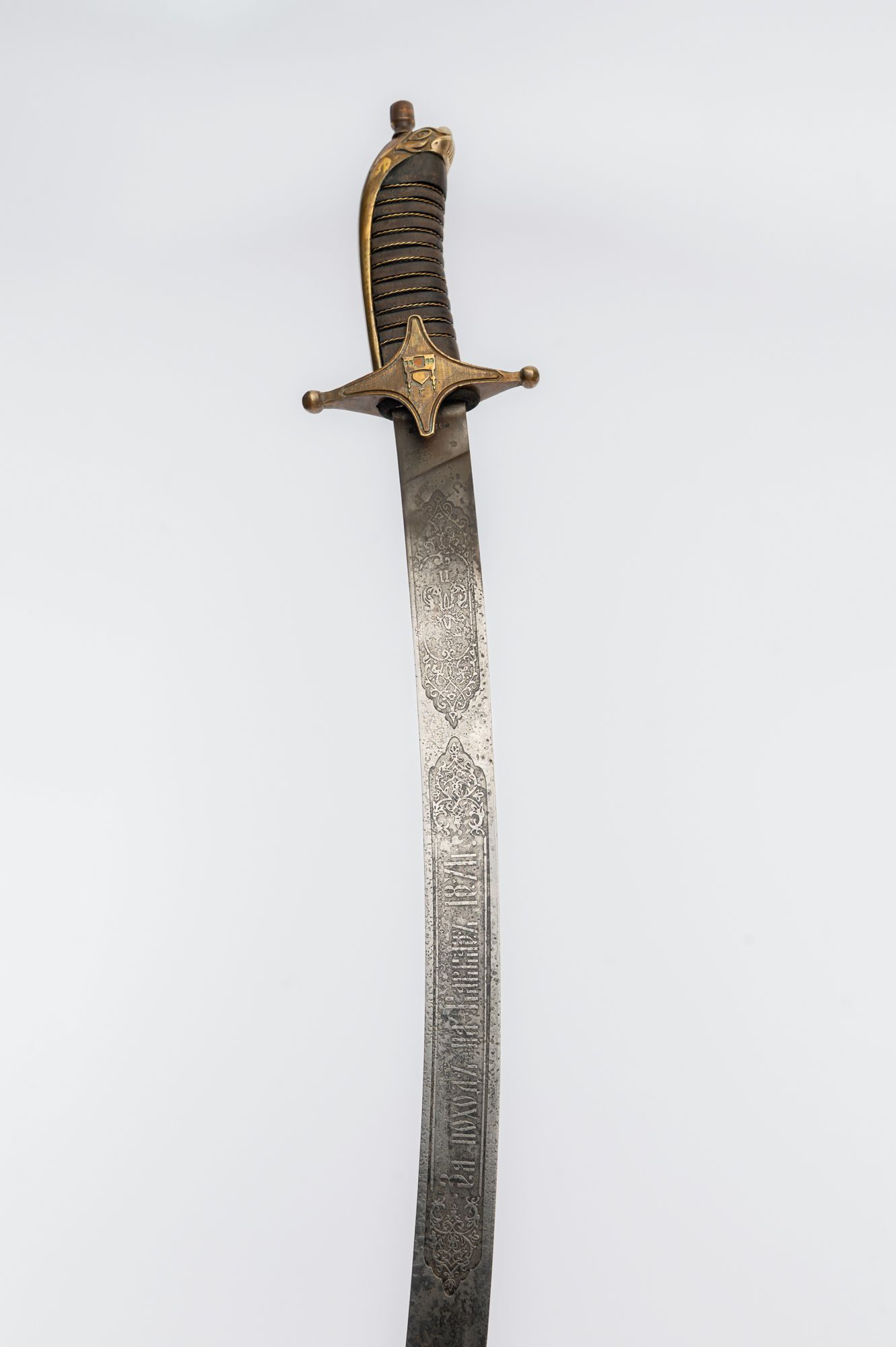 Клинок кованый, искривлённый, сталь 65г-высокоуглеродистая пружинная, рукоять -дерево, литьё-латунь. На клинке методом химического травления нанесён узор. Ножны изготовлены из дерева хвойных пород, обтянуты натуральной кожей. Металлические элементы выполнены из латуни. Сабля поставляется в кожаном чехле(винилискожа), в комплект также входит сертификат на изделие.