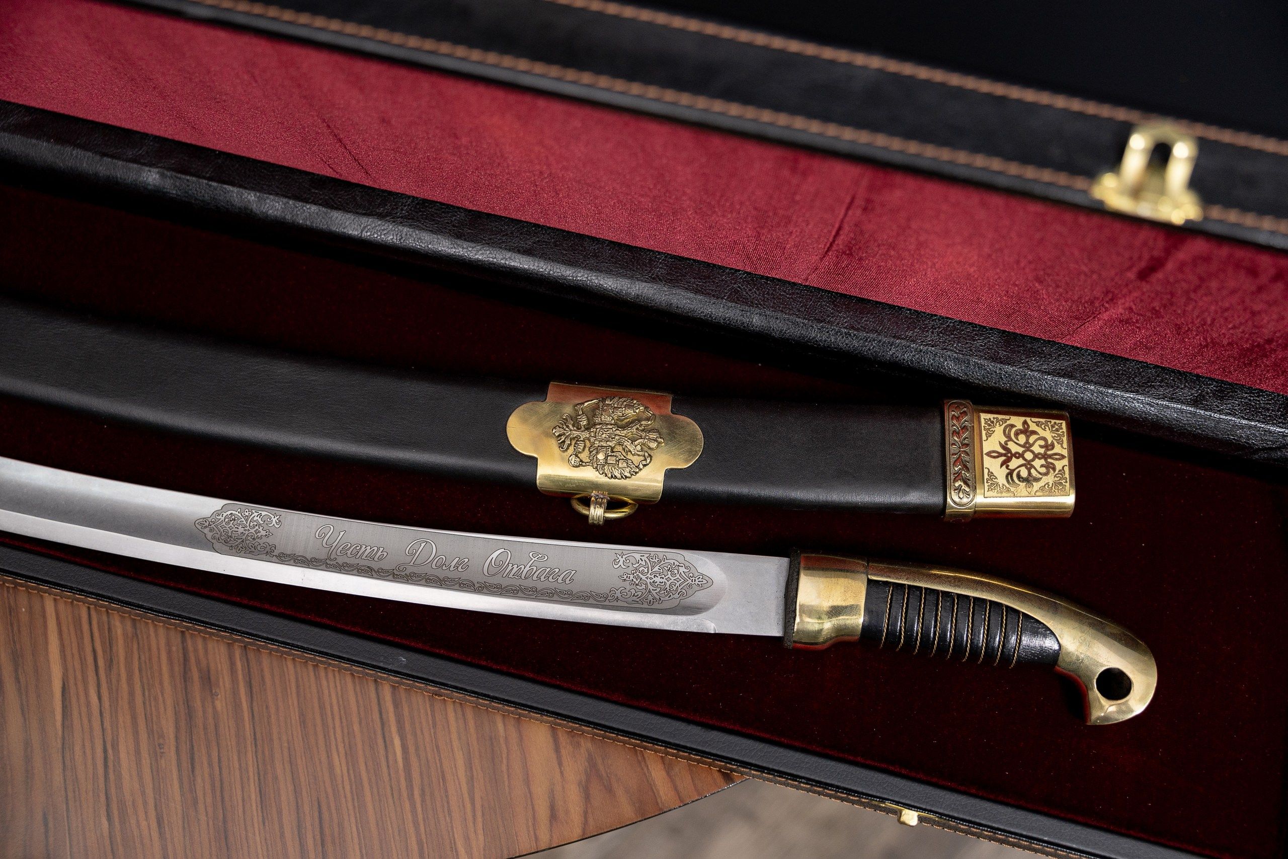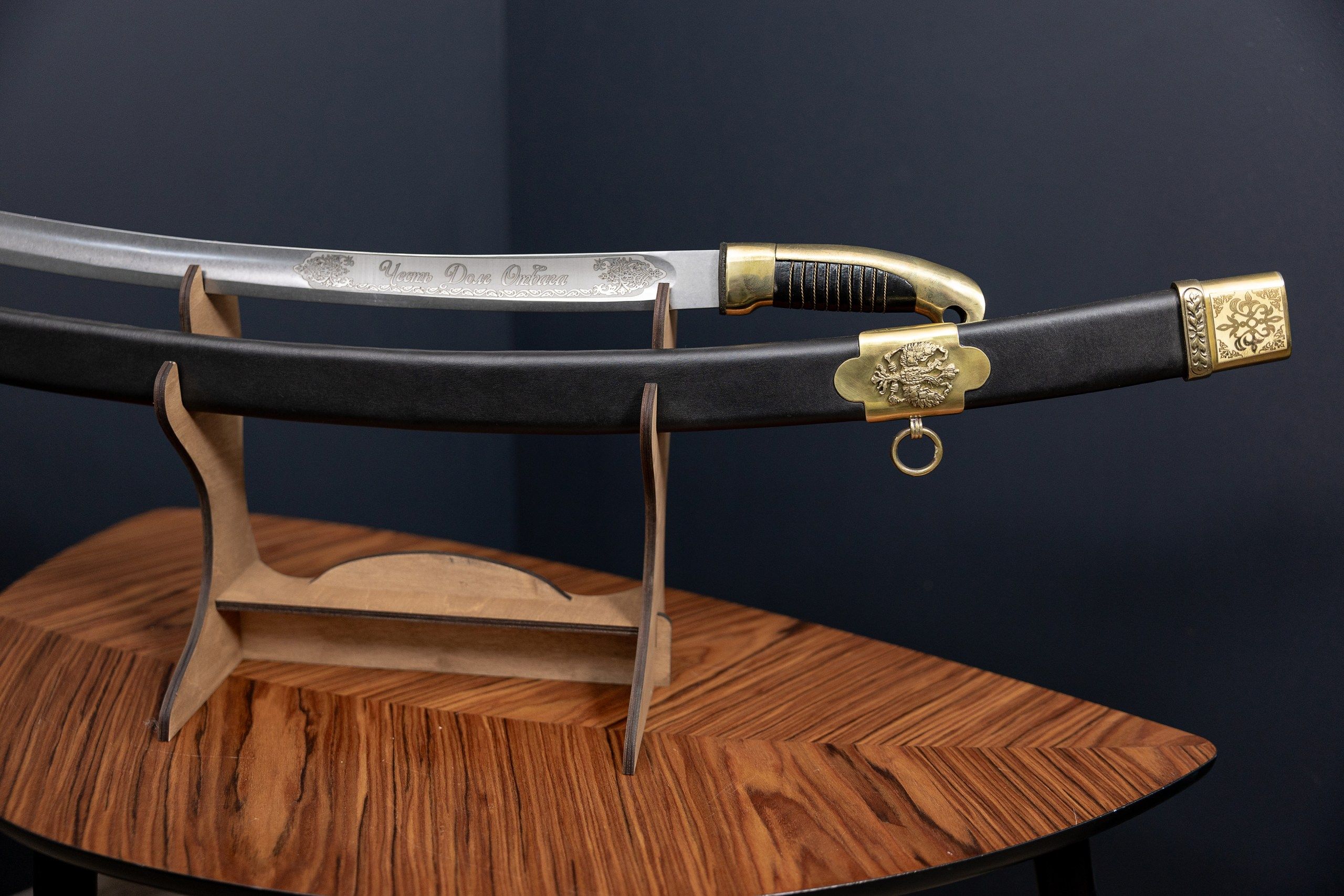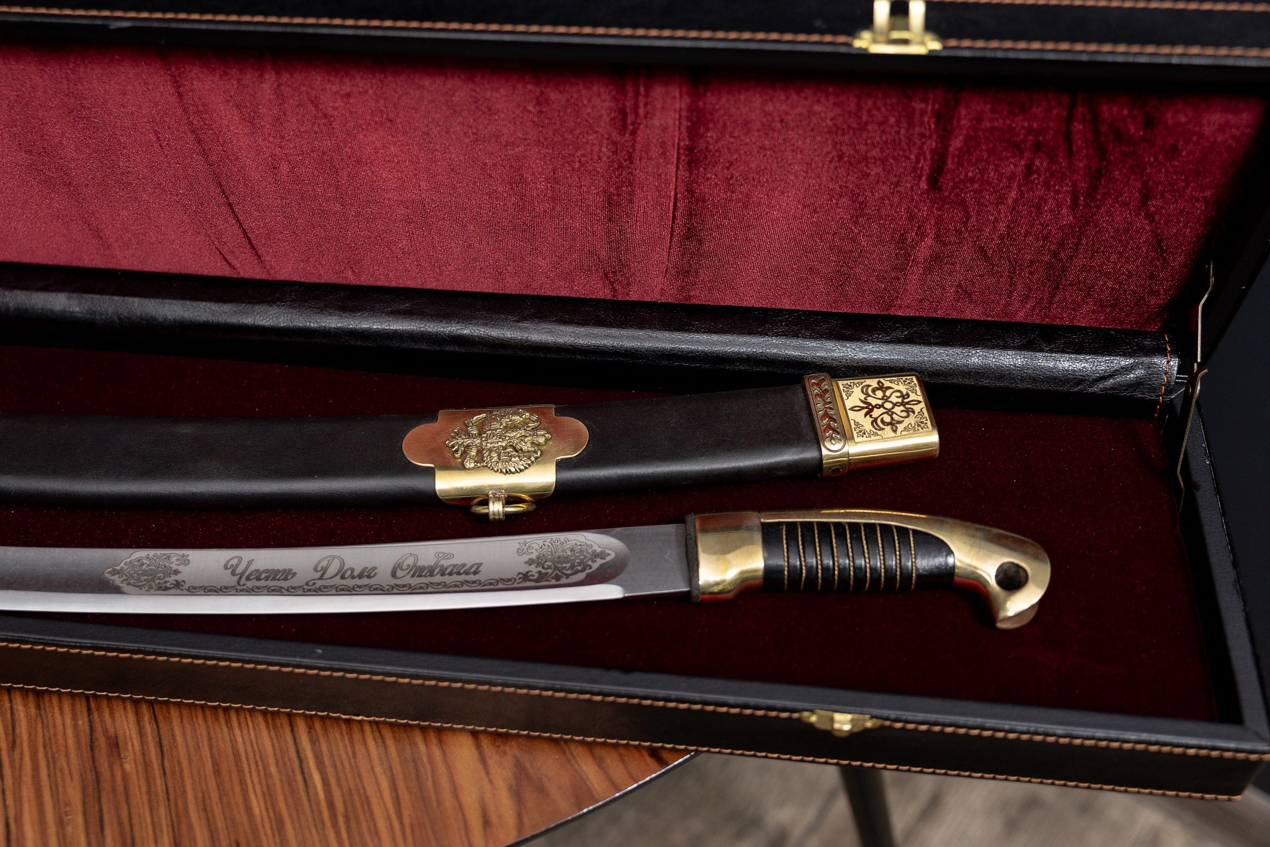 - Деревянные ножны (выполнены из массива хвойных пород, дополнительно обтянуты кожей).