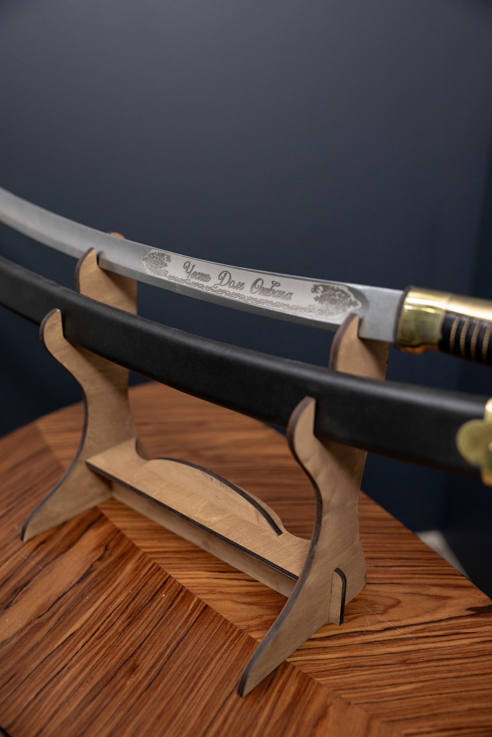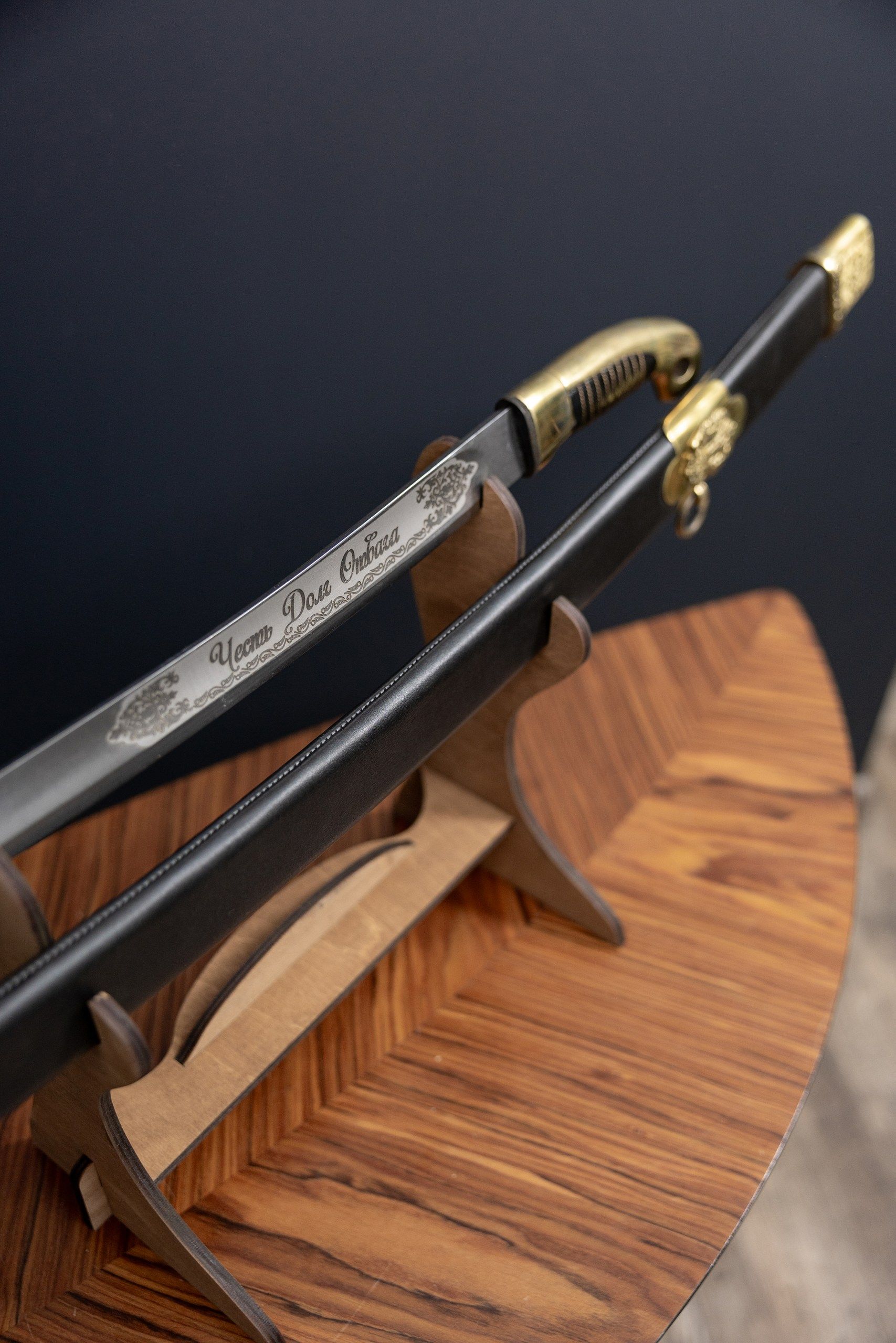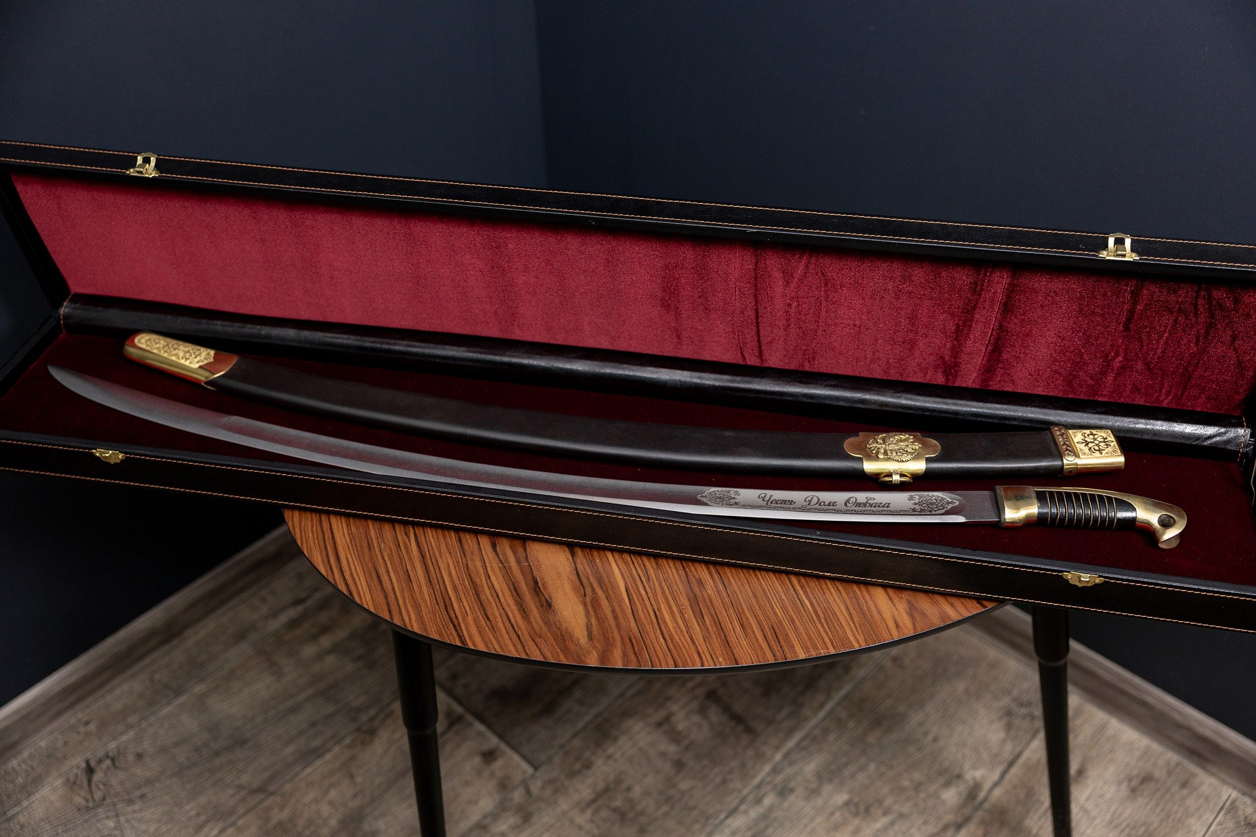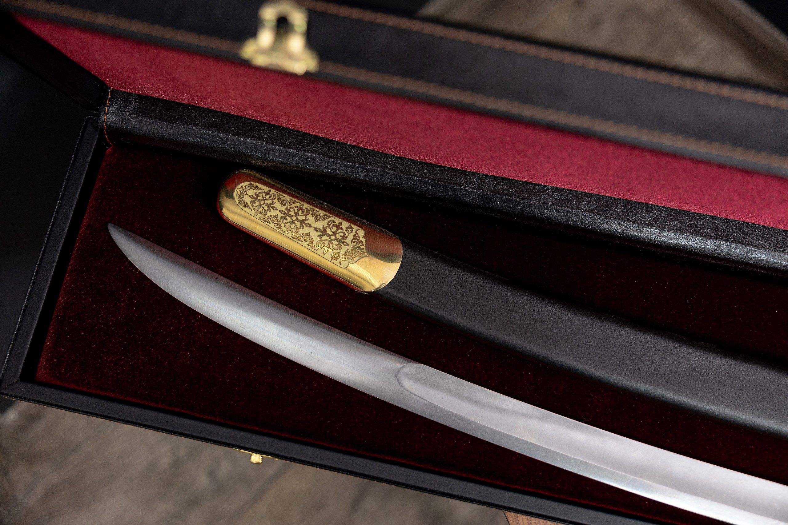 - Деревянные ножны (выполнены из массива хвойных пород, дополнительно обтянуты кожей).