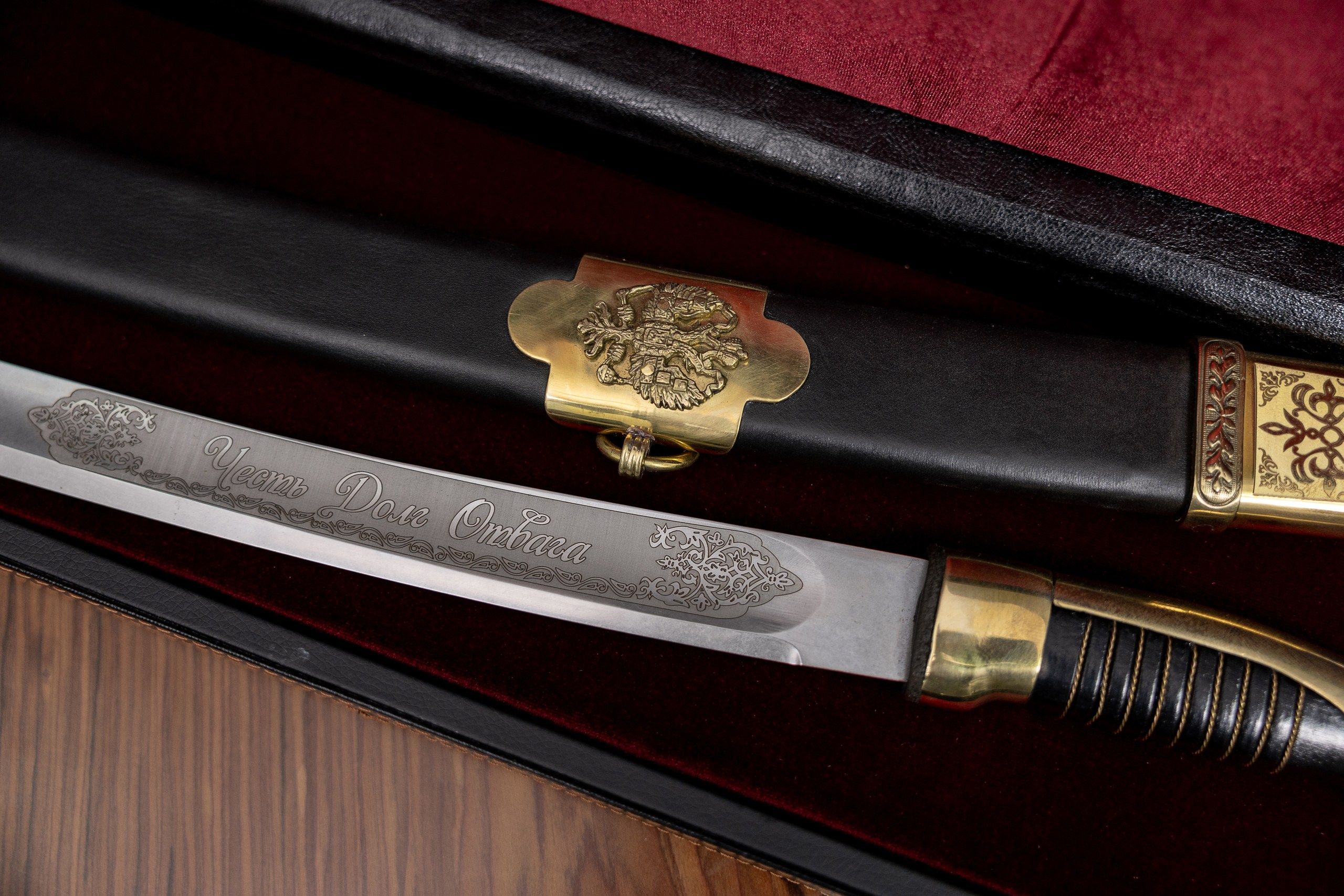 Клинок отличается уставной и твердой закалкой, которая увеличивается к боевому концу. Дополнен он надписями «За веру и Отечество» и «Честь, Долг, Отвага» с обеих сторон. Гравировка нанесена методом химического травления и дополнена узором. Поставляется шашка в кожаном чехле, выполняющем защитную функцию, а также,сопровождается сертификатом.