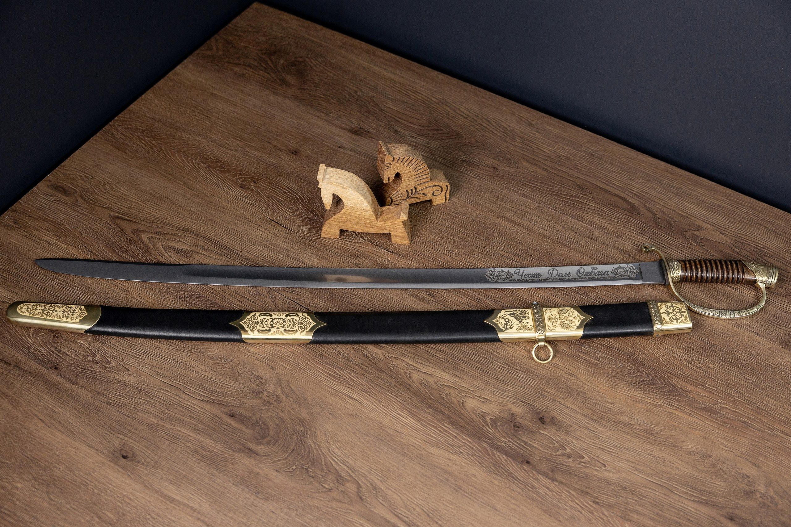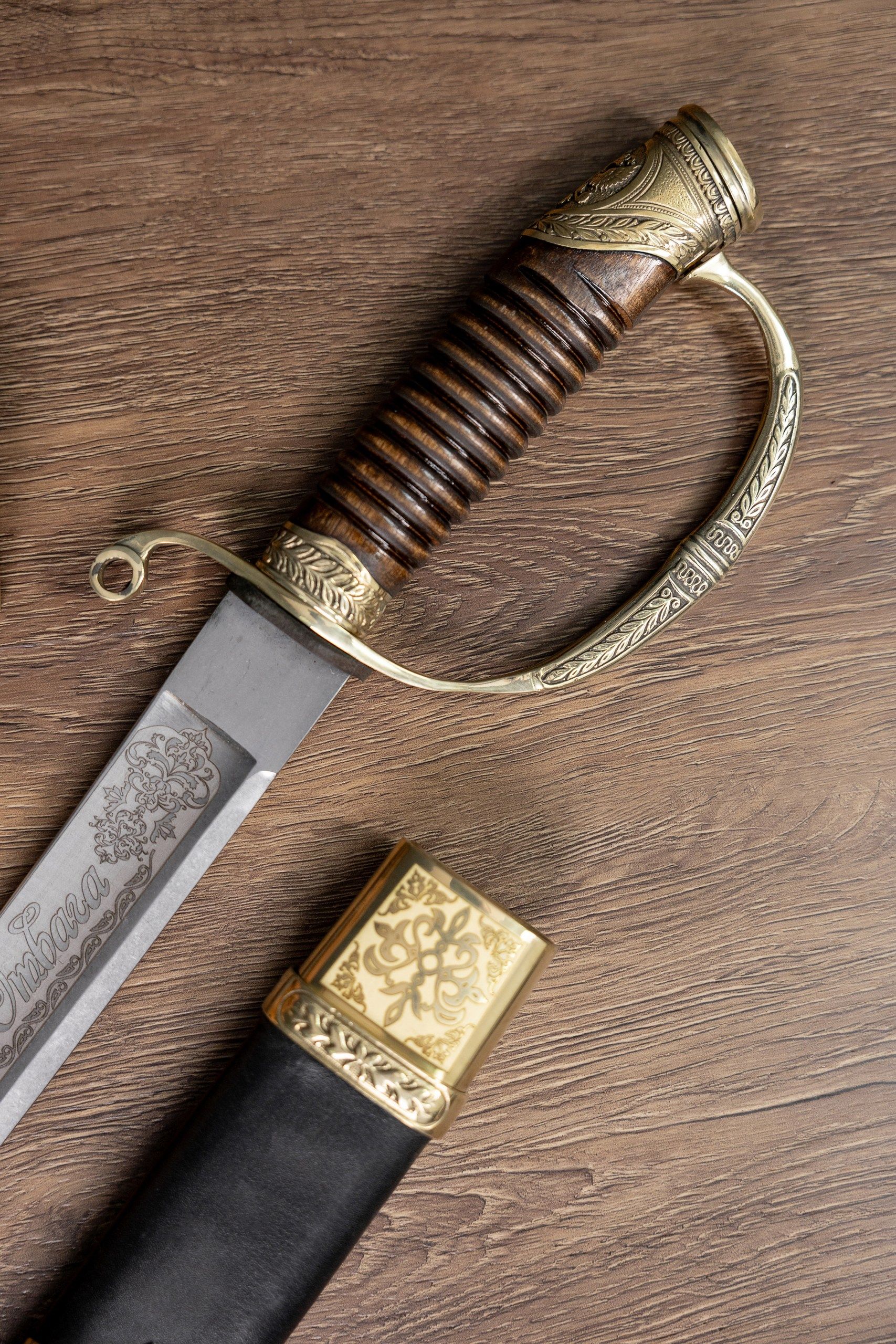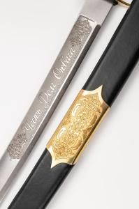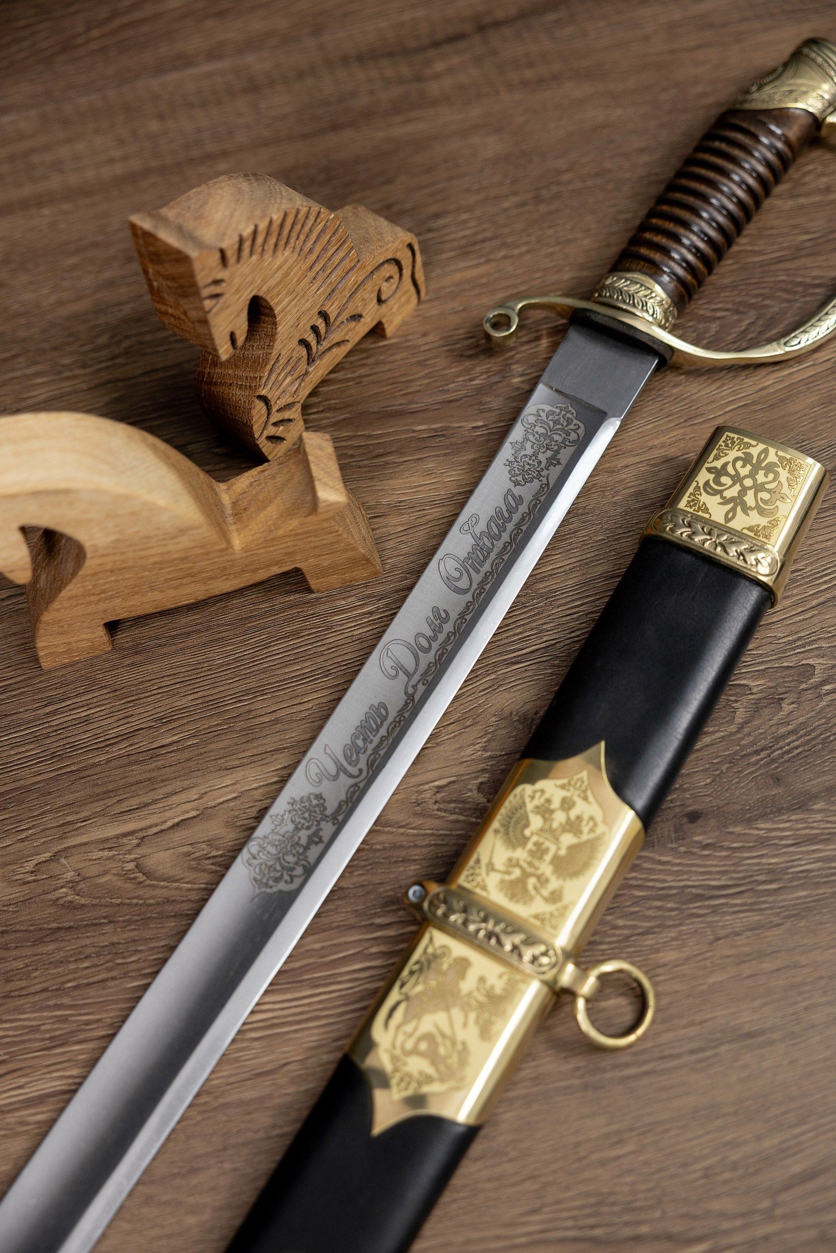 Расположены они с обеих сторон. Нанесены надписи путем химического травления. Дополнены они узорами. Рукоять оружия произведена из латуни. Черен — из массива березы. Также из дерева выполнены ножны. Дополнительно они обтянуты натуральной кожей. Шашка упаковывается в кожаный защитный чехол и поставляется вместе с сертификатом соответствия.