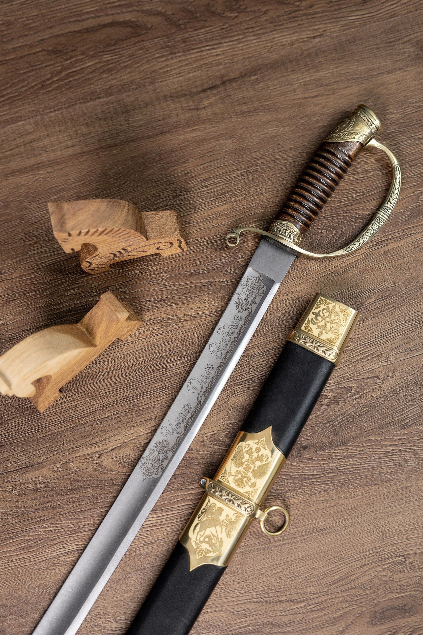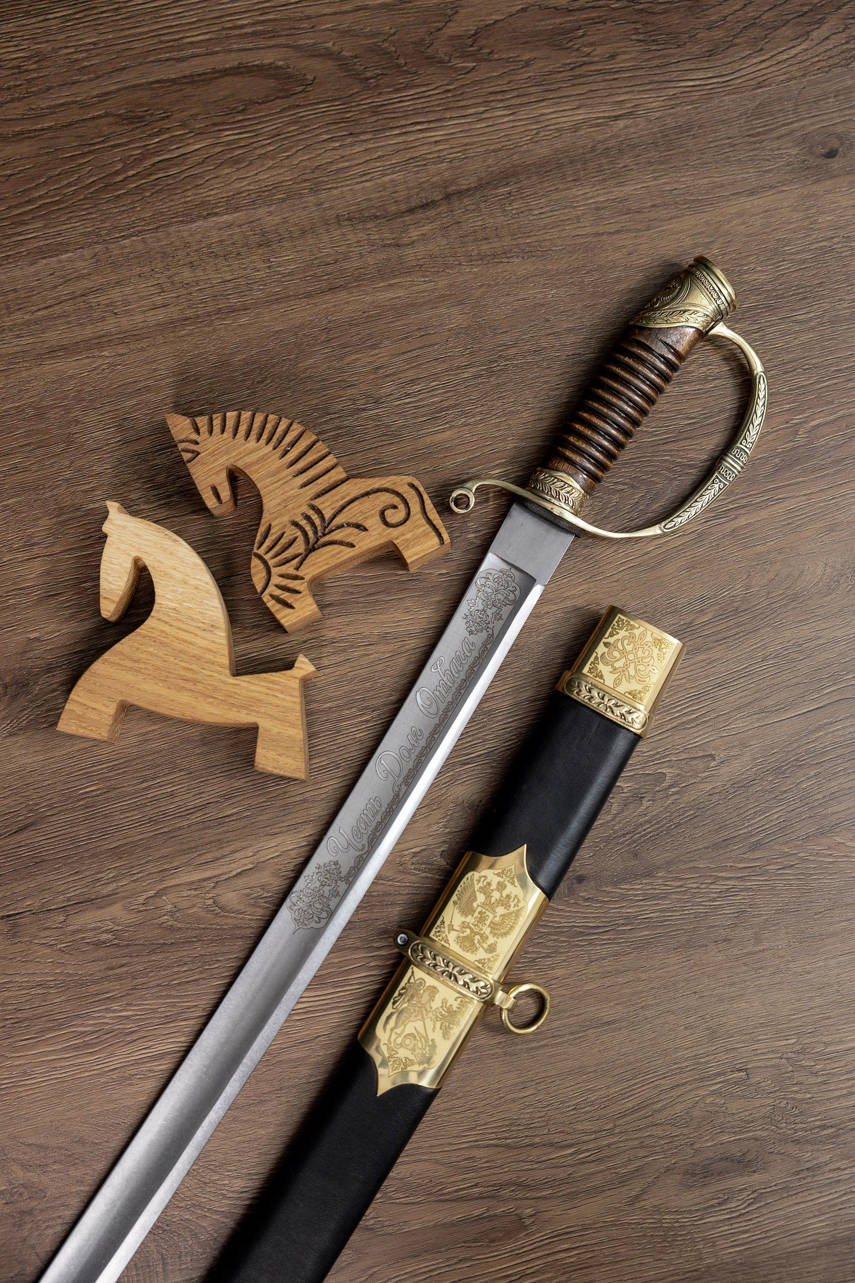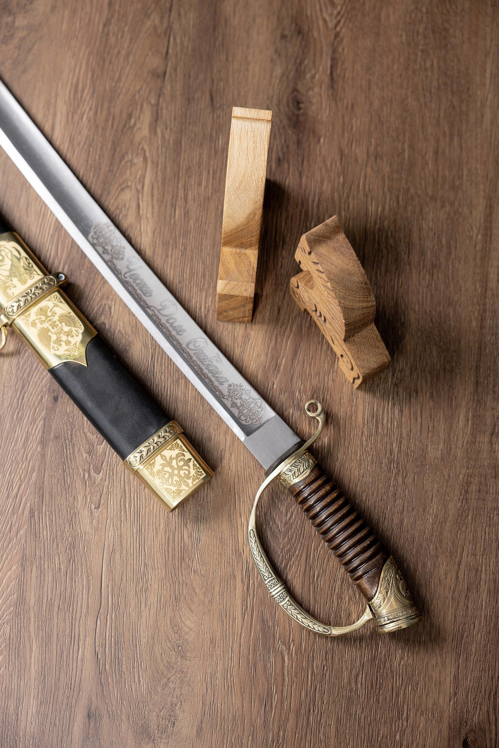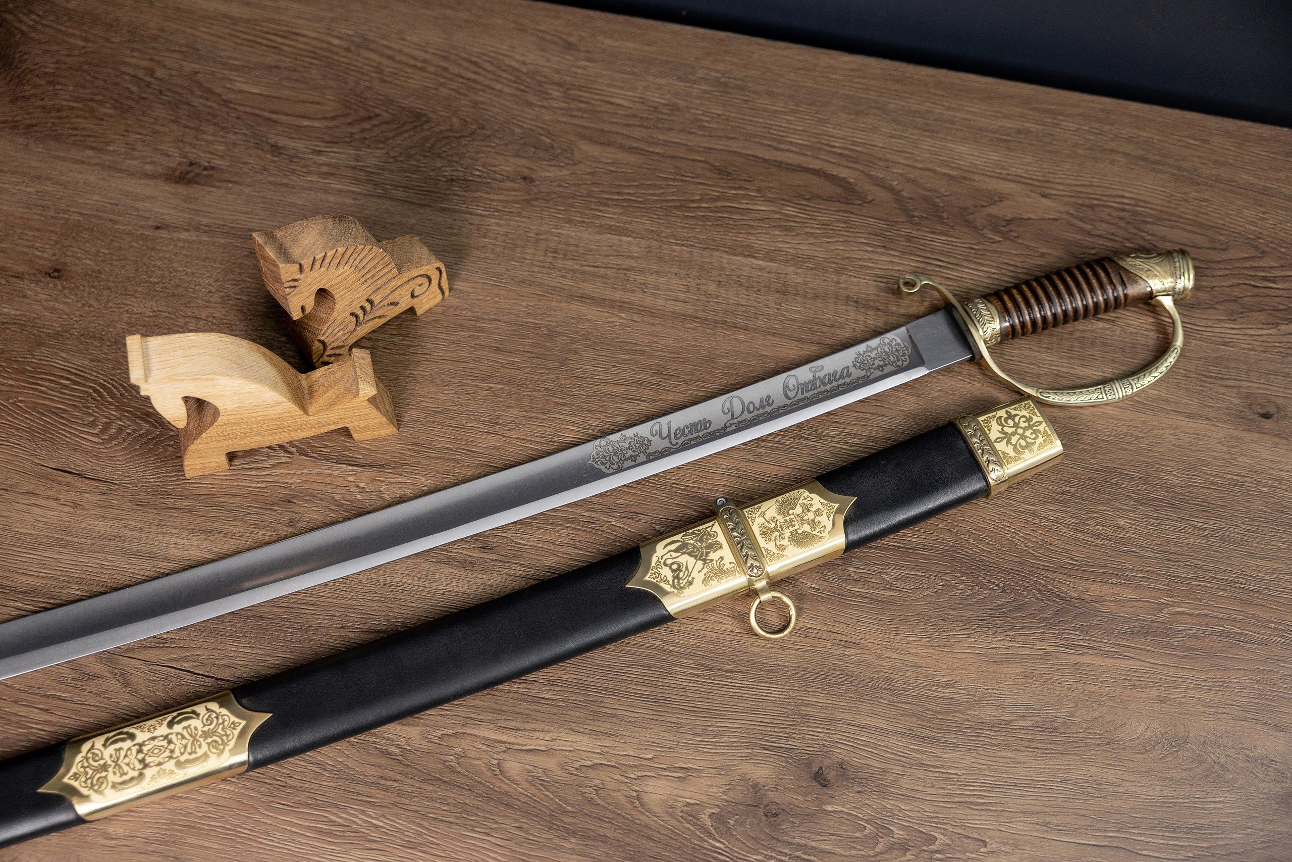 Расположены они с обеих сторон. Нанесены надписи путем химического травления. Дополнены они узорами. Рукоять оружия произведена из латуни. Черен — из массива березы. Также из дерева выполнены ножны. Дополнительно они обтянуты натуральной кожей. Шашка упаковывается в кожаный защитный чехол и поставляется вместе с сертификатом соответствия.