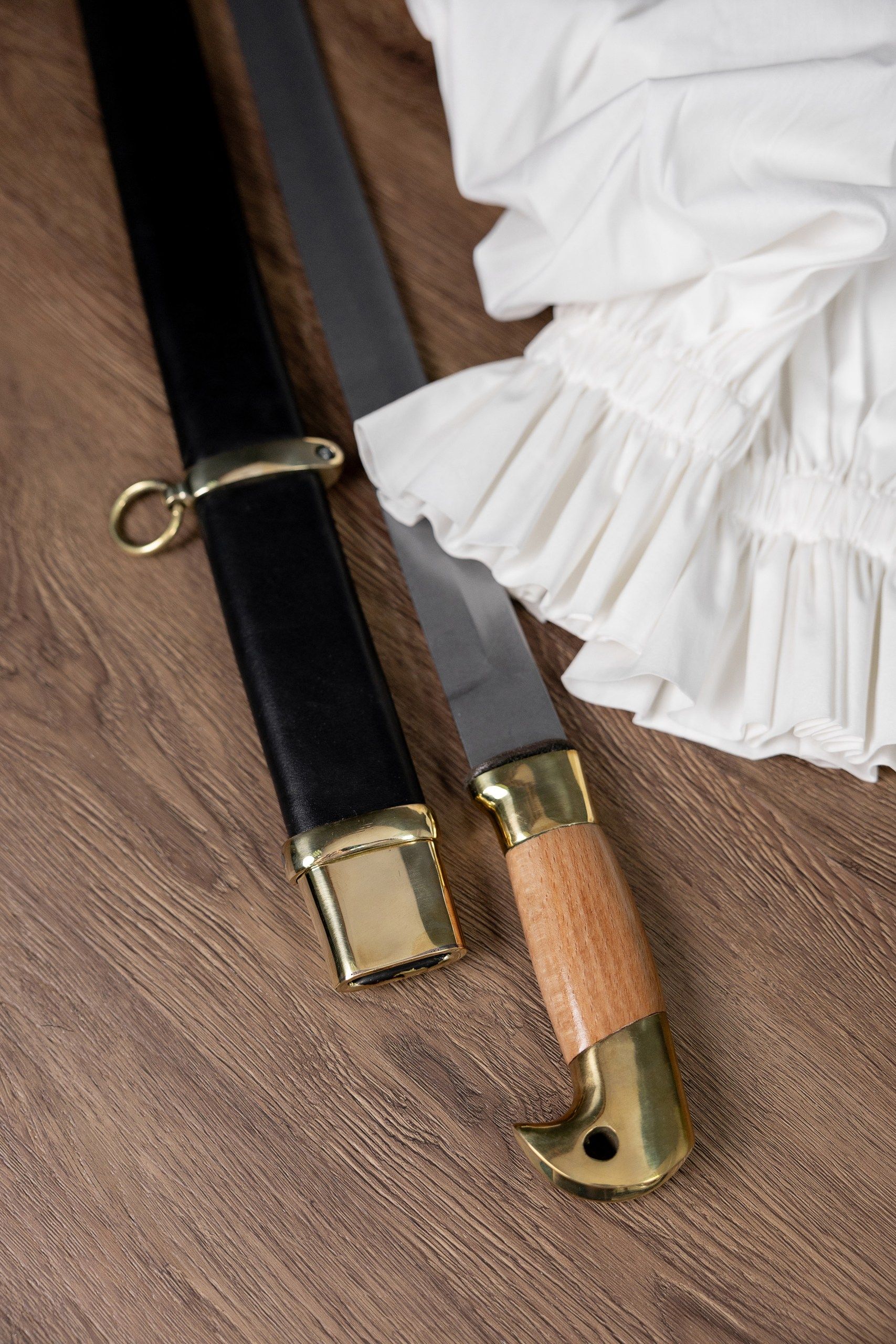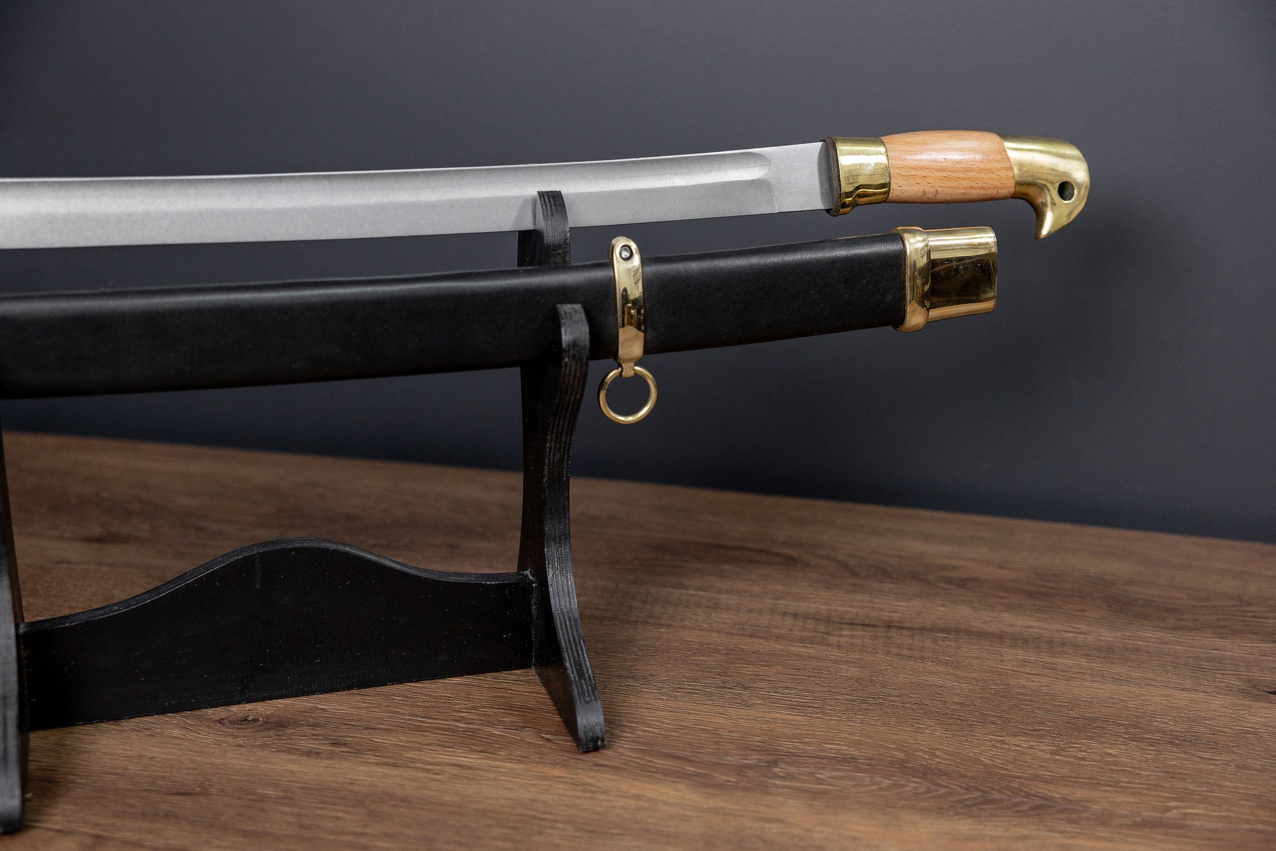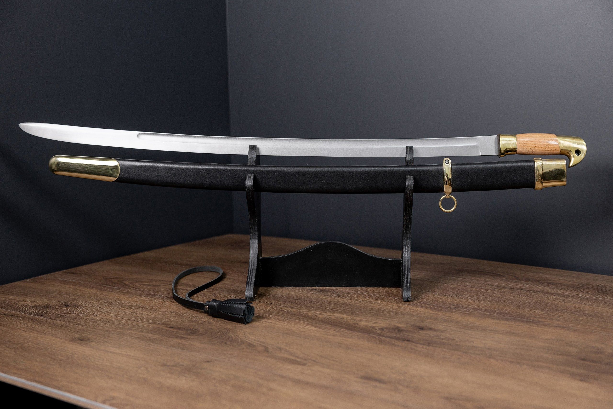 Клинок кованый, прямой, изготовлен из высокопрочной стали 65г, содержит один широкий дол. Кромка клинка подведена под заточку. Закалка клинка зонная, уставная, твёрдость меняется от рукояти к концу. Хвостовик клинка цельнокованый, проходит сквозь всю рукоять, снаружи стягивается гайкой, без подпилов. Рукоять деревянная, гладкая, приборы рукояти выполнены из латуни. Ножны деревянные, обтянуты натуральной кожей, приборы ножен также латунные. В комплект входит: защитный чехол из винилискожи, сертификат.