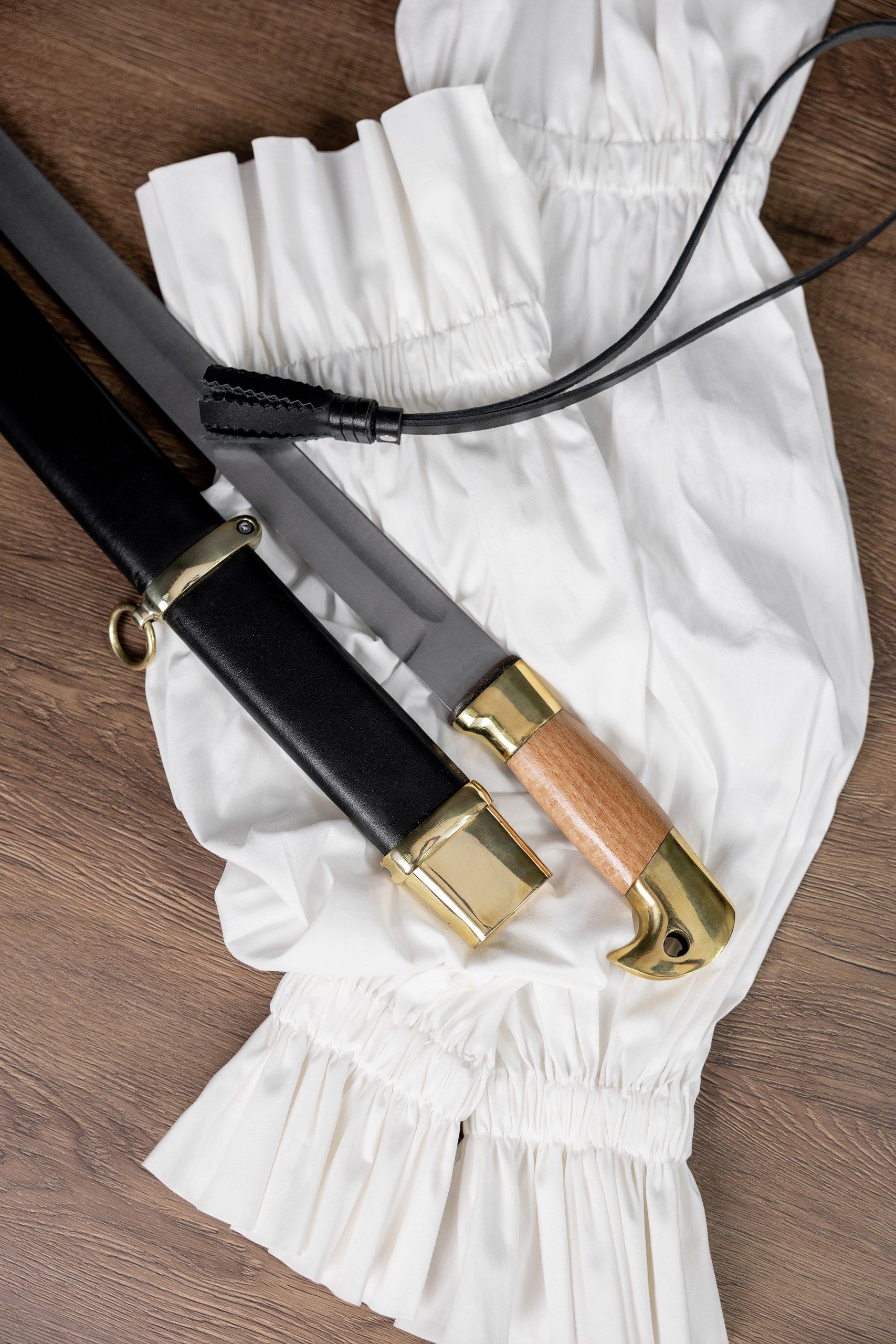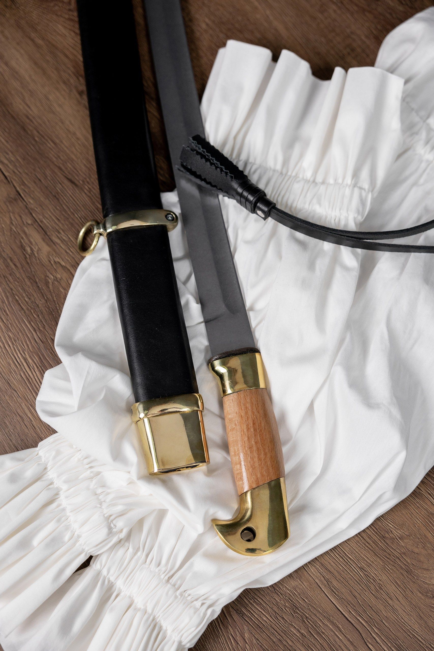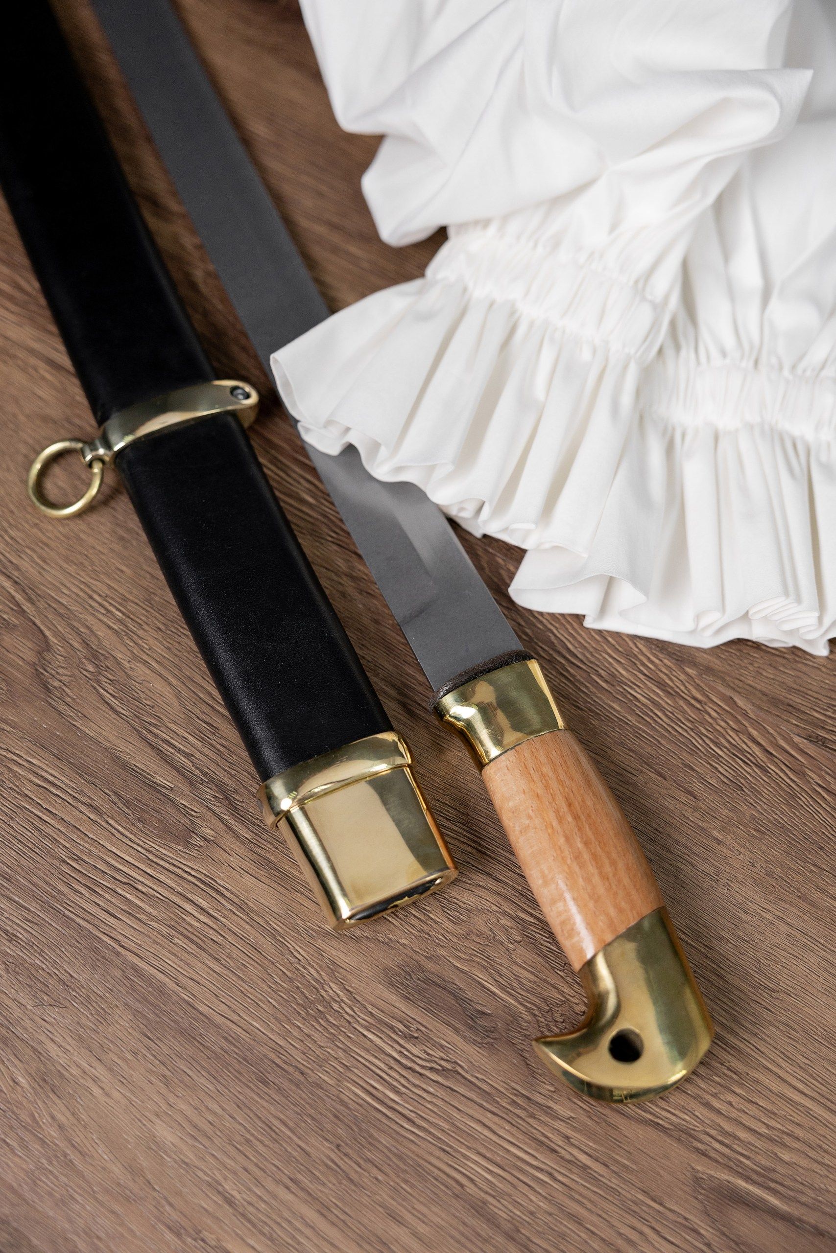 Клинок кованый, прямой, изготовлен из высокопрочной стали 65г, содержит один широкий дол. Кромка клинка подведена под заточку. Закалка клинка зонная, уставная, твёрдость меняется от рукояти к концу. Хвостовик клинка цельнокованый, проходит сквозь всю рукоять, снаружи стягивается гайкой, без подпилов. Рукоять деревянная, гладкая, приборы рукояти выполнены из латуни. Ножны деревянные, обтянуты натуральной кожей, приборы ножен также латунные. В комплект входит: защитный чехол из винилискожи, сертификат.
