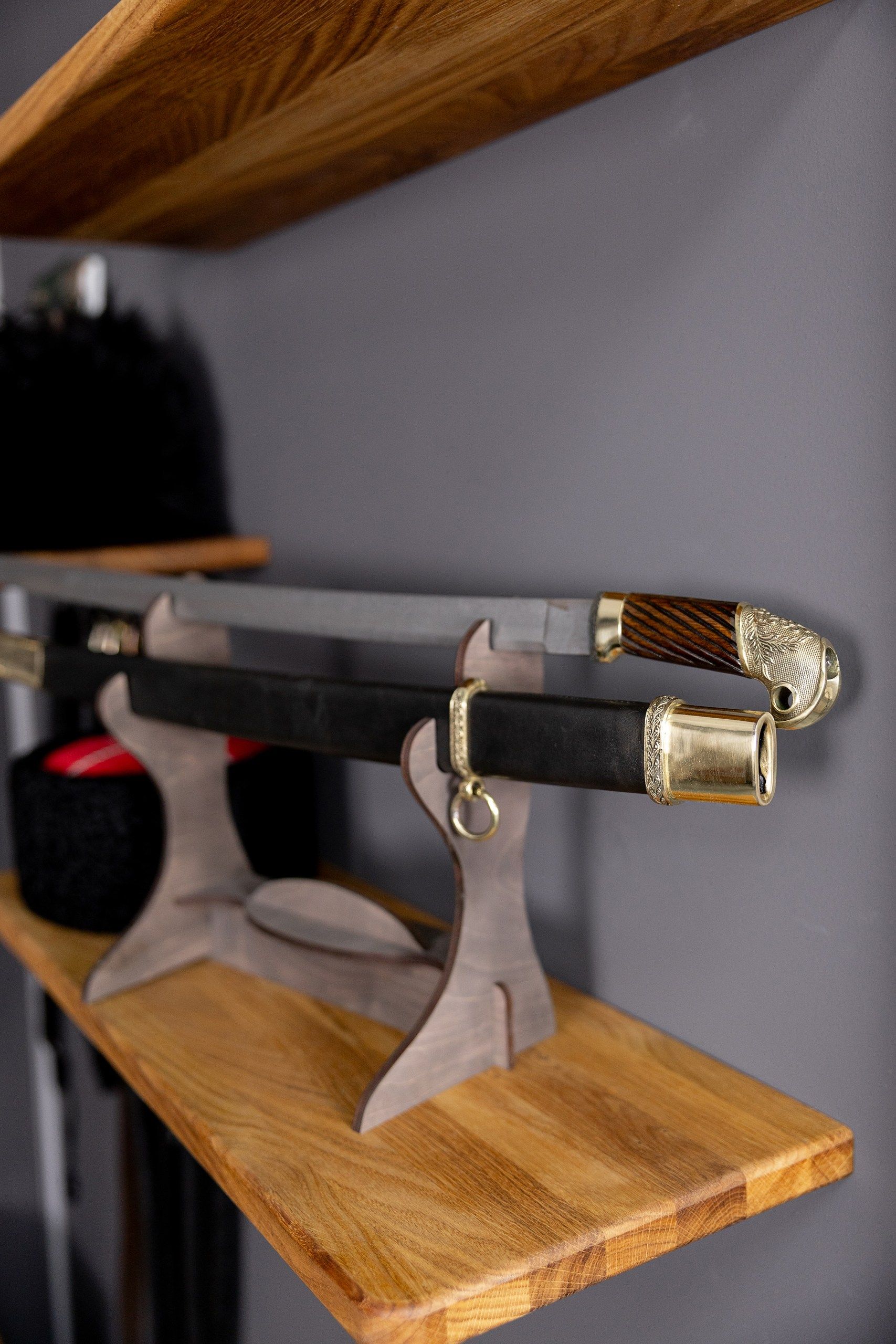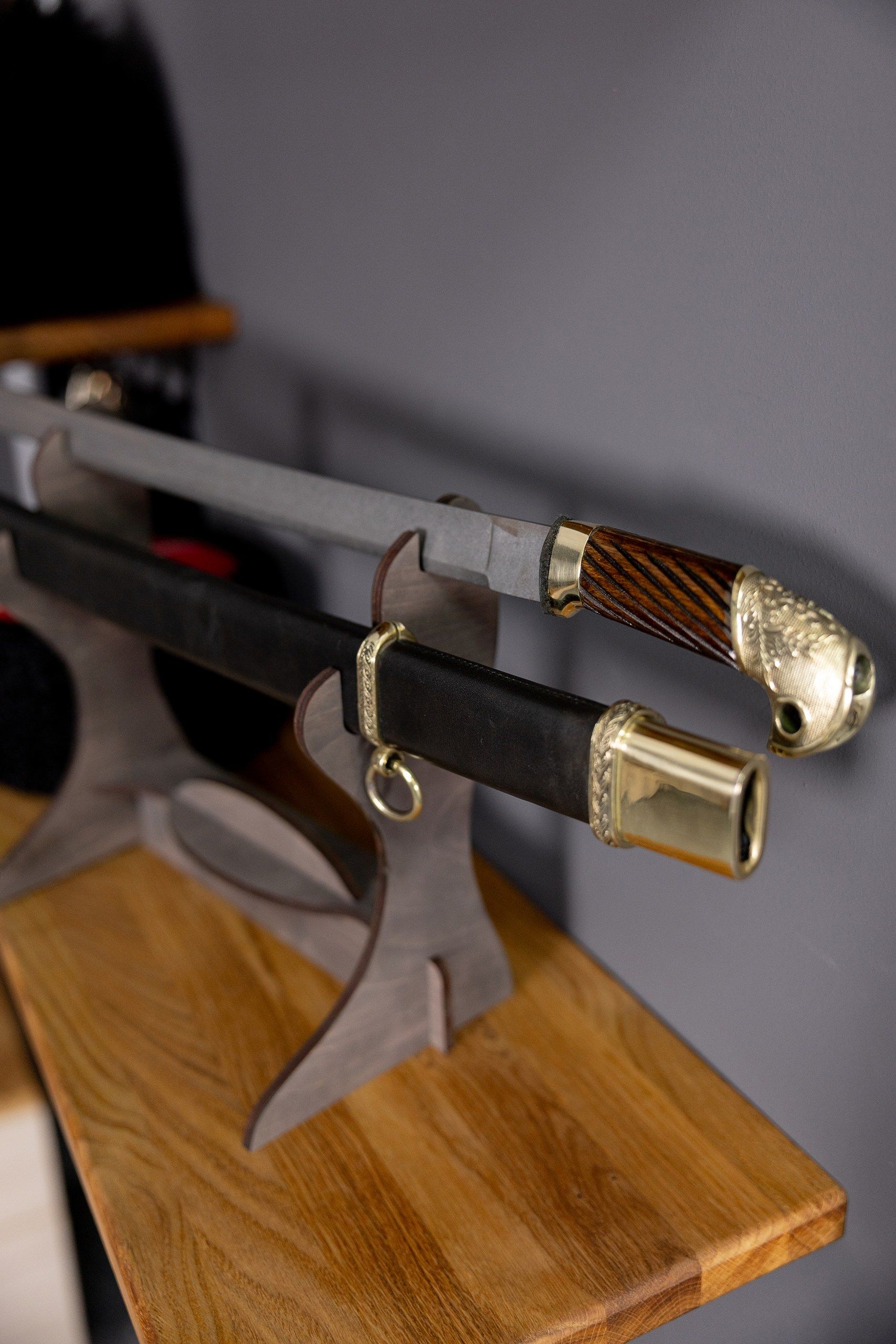 - Рукоять выполнена из дерева и оснащена поперечными желобками. Элементы рукояти изготовлены из латуни. Для повышения износостойкости и удобства использования деревянные ножны обтянуты кожей. Их элементы — также латунные.