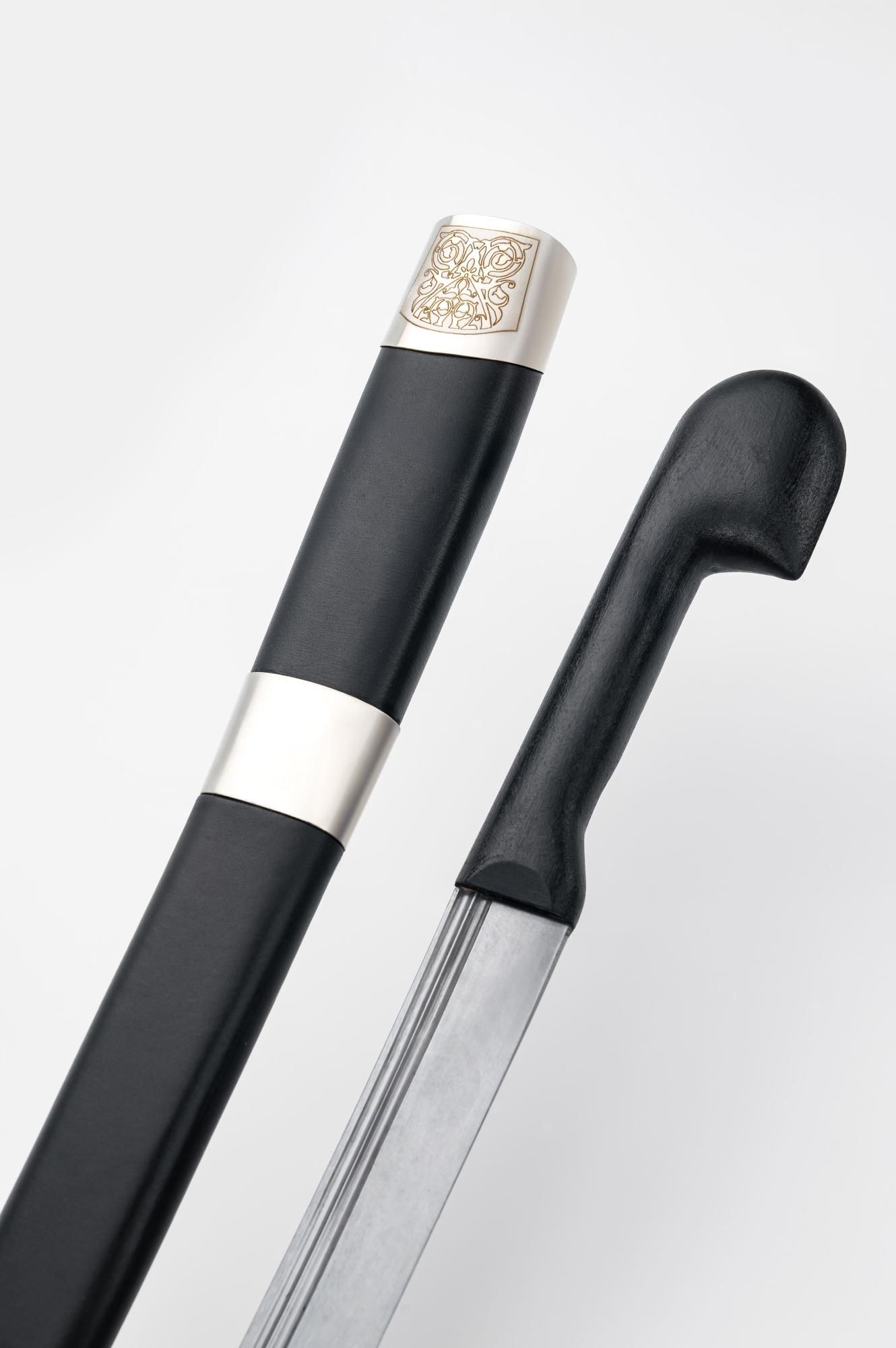 Упакована шашка в защитный чехол, выполненный из эко-кожи. Его можно использовать для хранения оружия и его транспортировки. Также в комплект входит оружейное масло, предназначенное для ухода за шашкой, и сертификат.