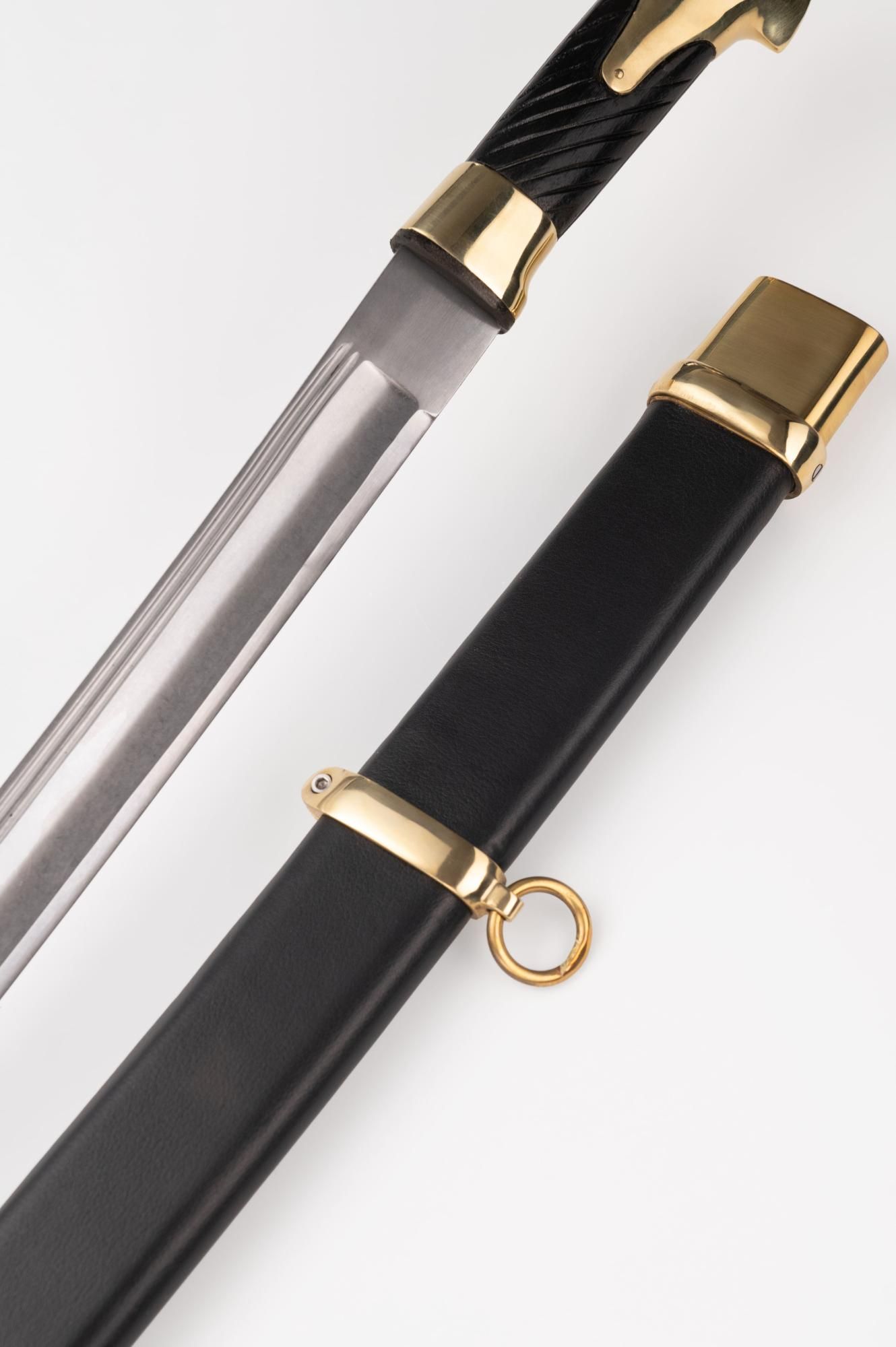 - Рукоять орудия выполнена из дерева и оснащена поперечными желобками. Дополнительные элементы рукояти произведены из латуни. Из дерева выполнены ножны. Сверху они покрыты кожей. Их приборы также латунные.
