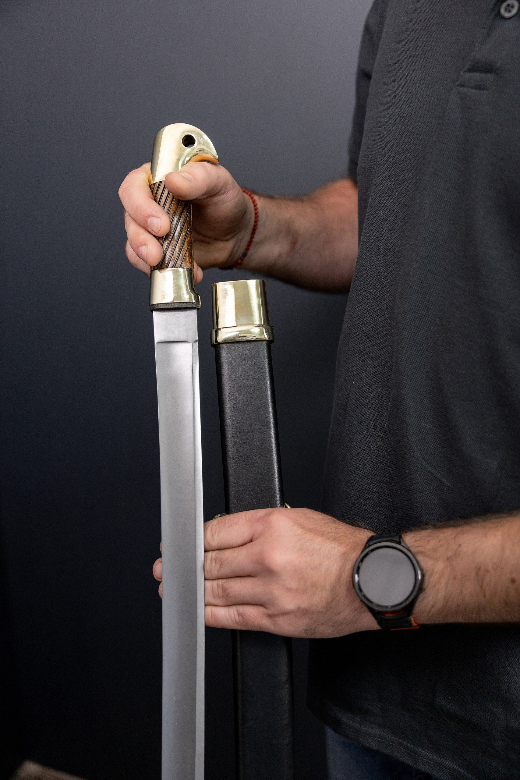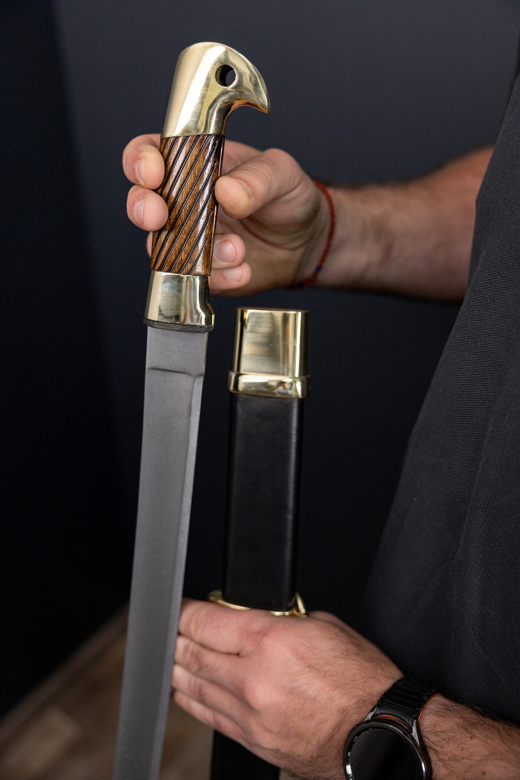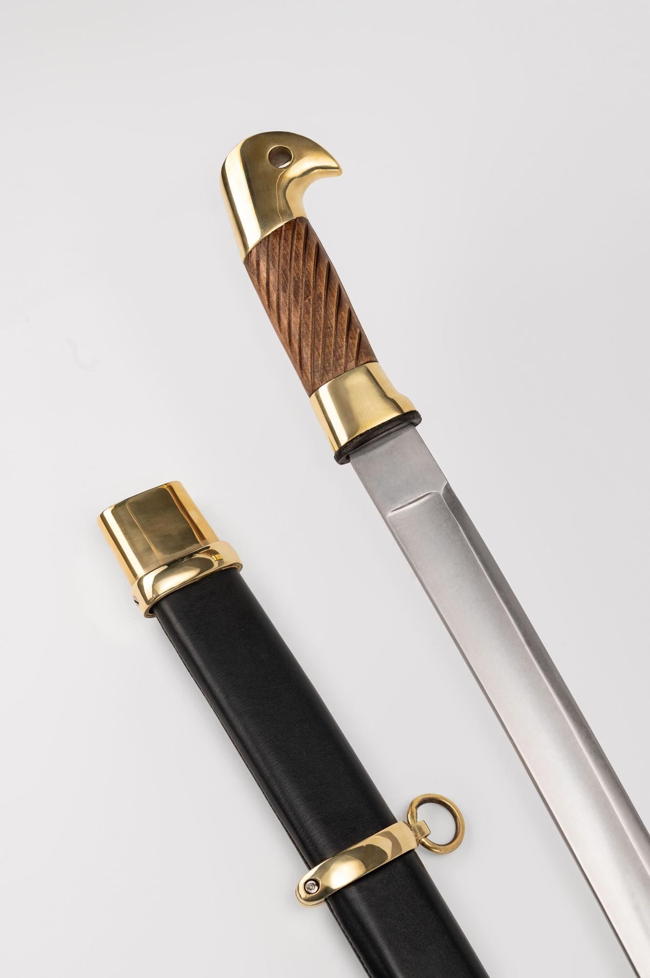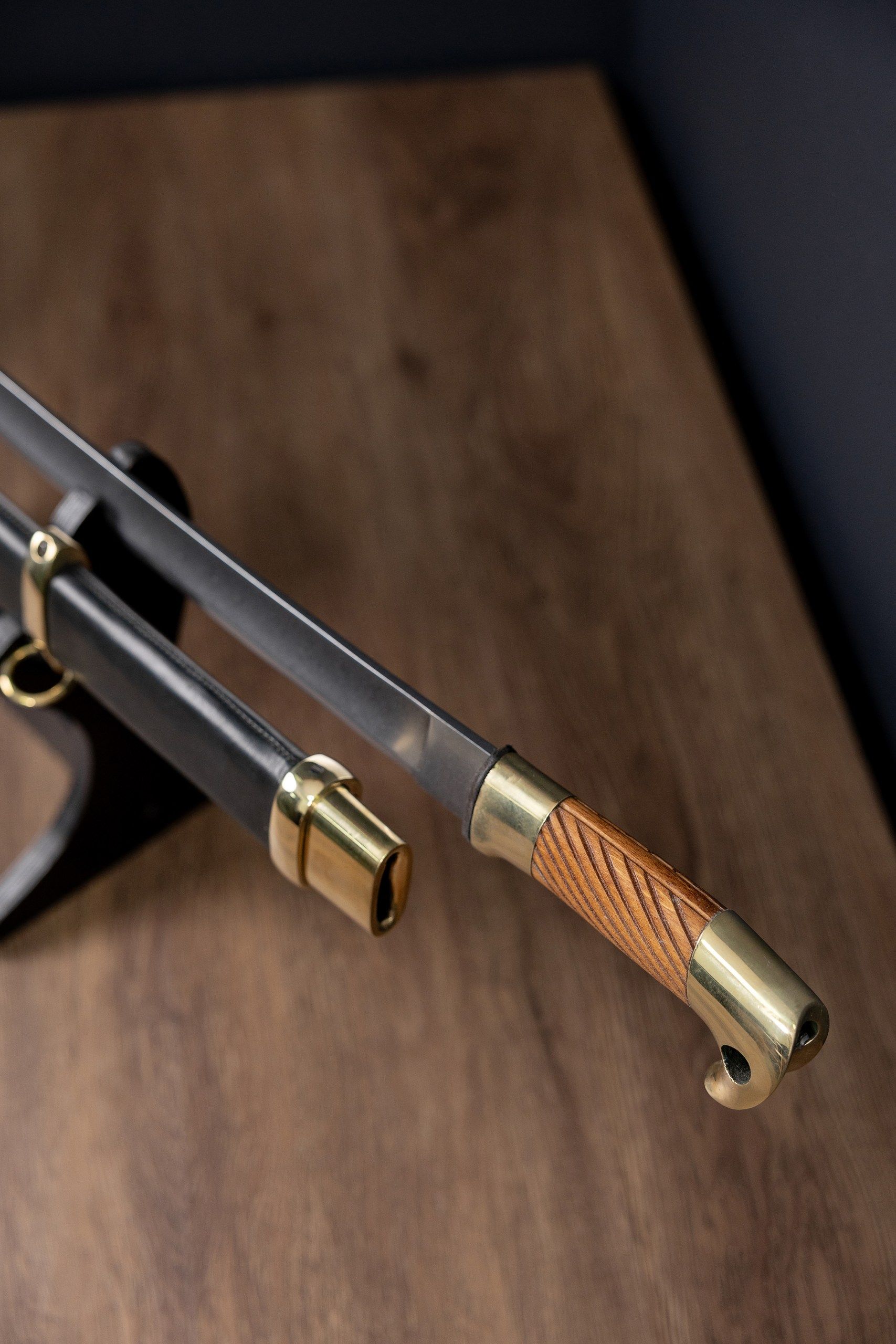 Хвостовик клинка, проходящий через всю рукоять, является цельнокованым и закрепляется снаружи гайкой. Рукоять выполнена из дерева и дополнена латунными приборами. Ножны — также деревянные. Сверху обтянуты натуральной кожей. Имеющиеся на них приборы также выполнены из латуни.
