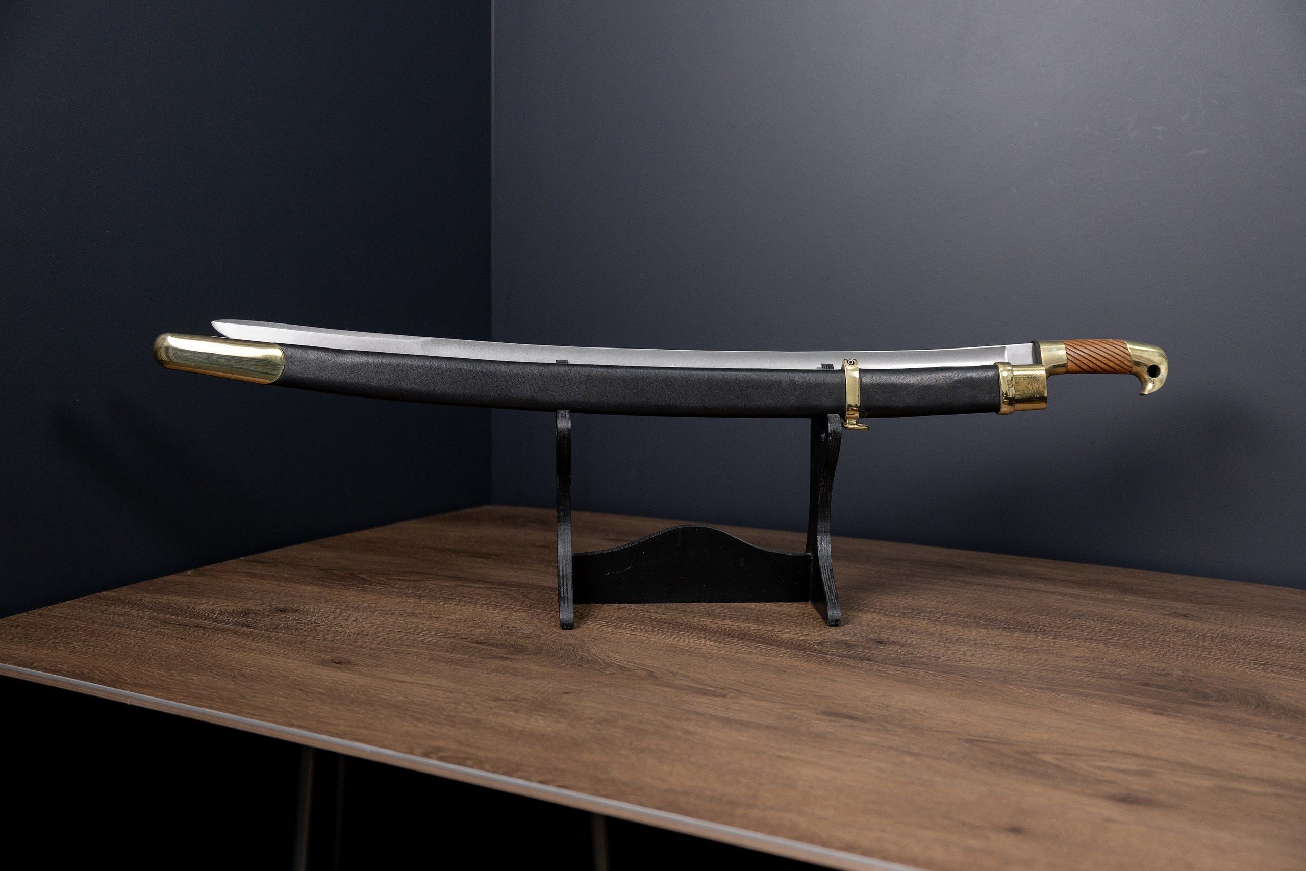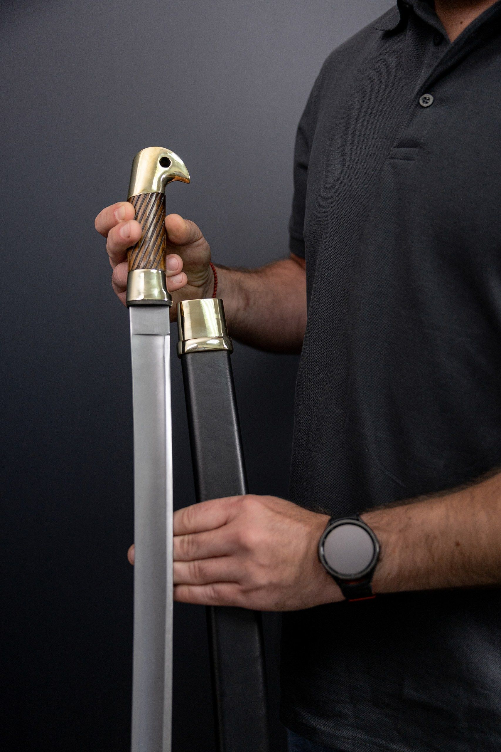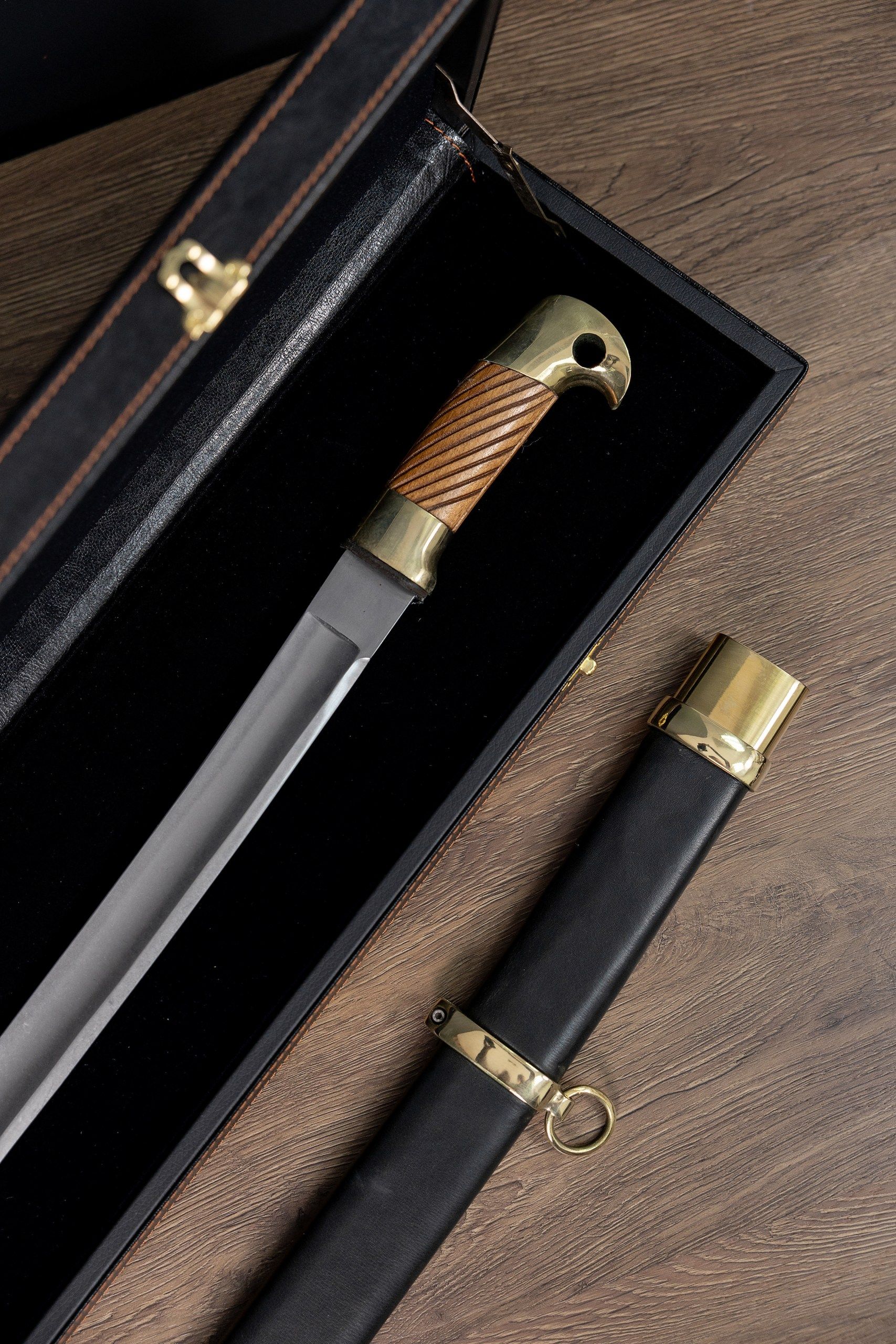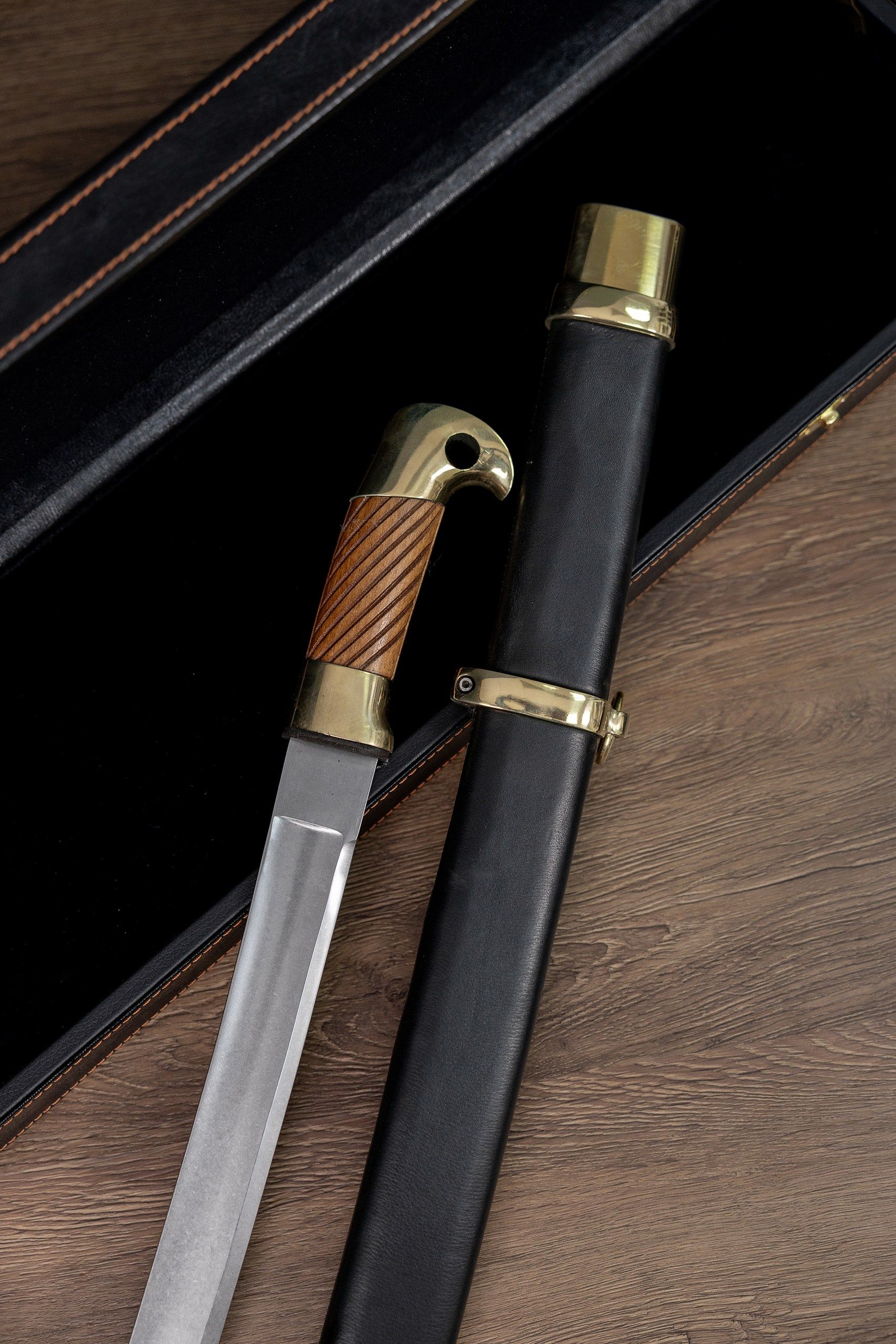 Хвостовик клинка, проходящий через всю рукоять, является цельнокованым и закрепляется снаружи гайкой. Рукоять выполнена из дерева и дополнена латунными приборами. Ножны — также деревянные. Сверху обтянуты натуральной кожей. Имеющиеся на них приборы также выполнены из латуни.