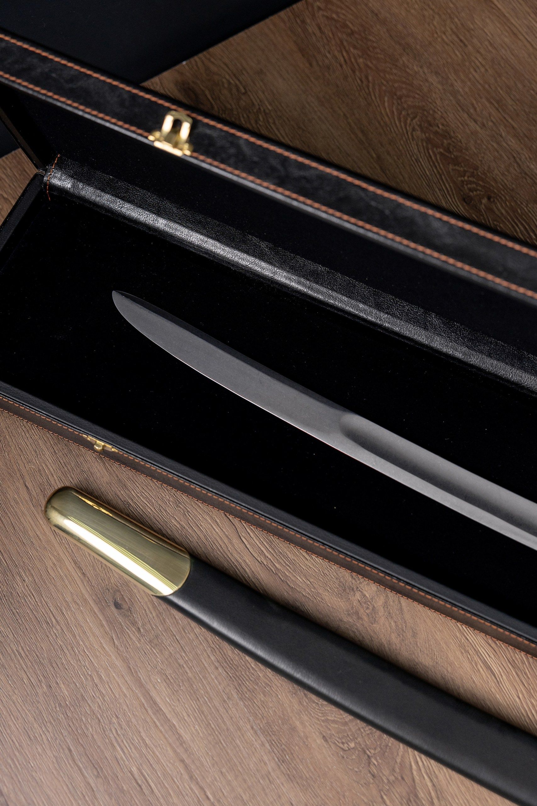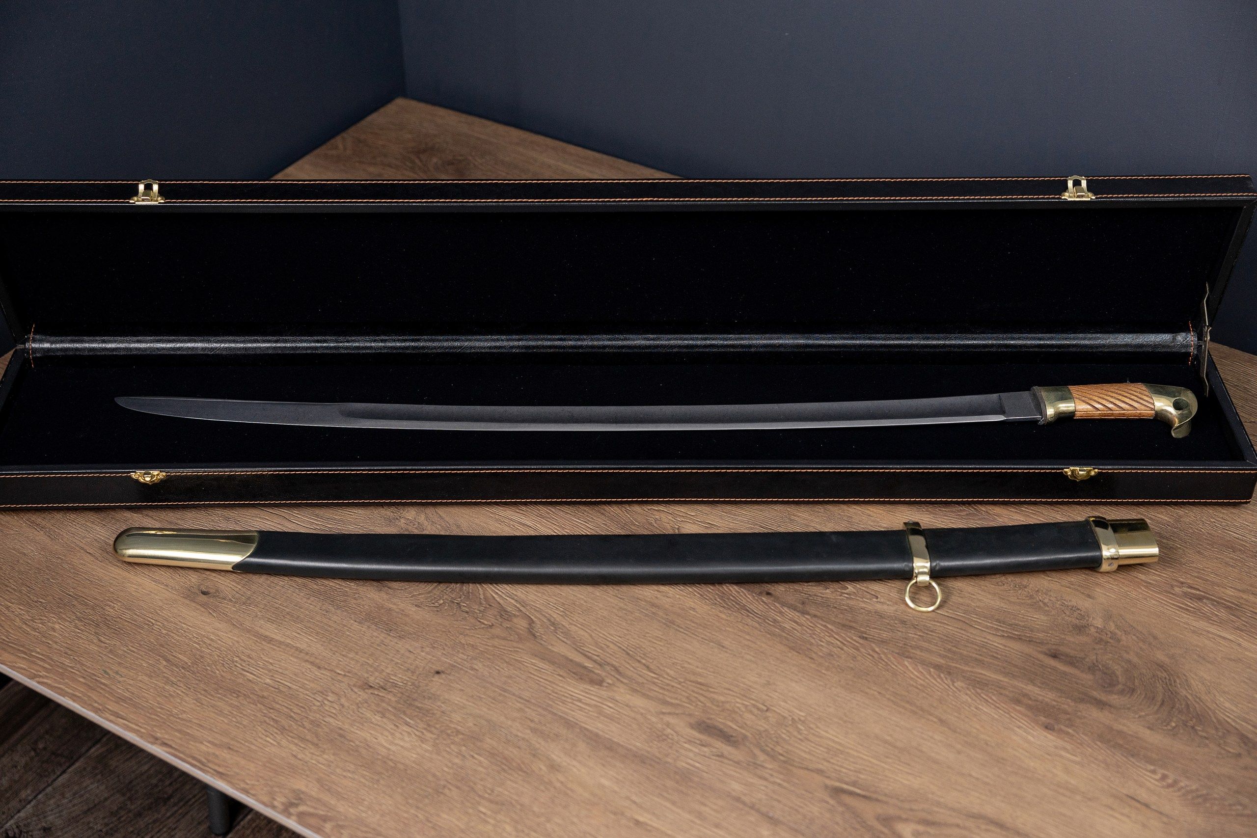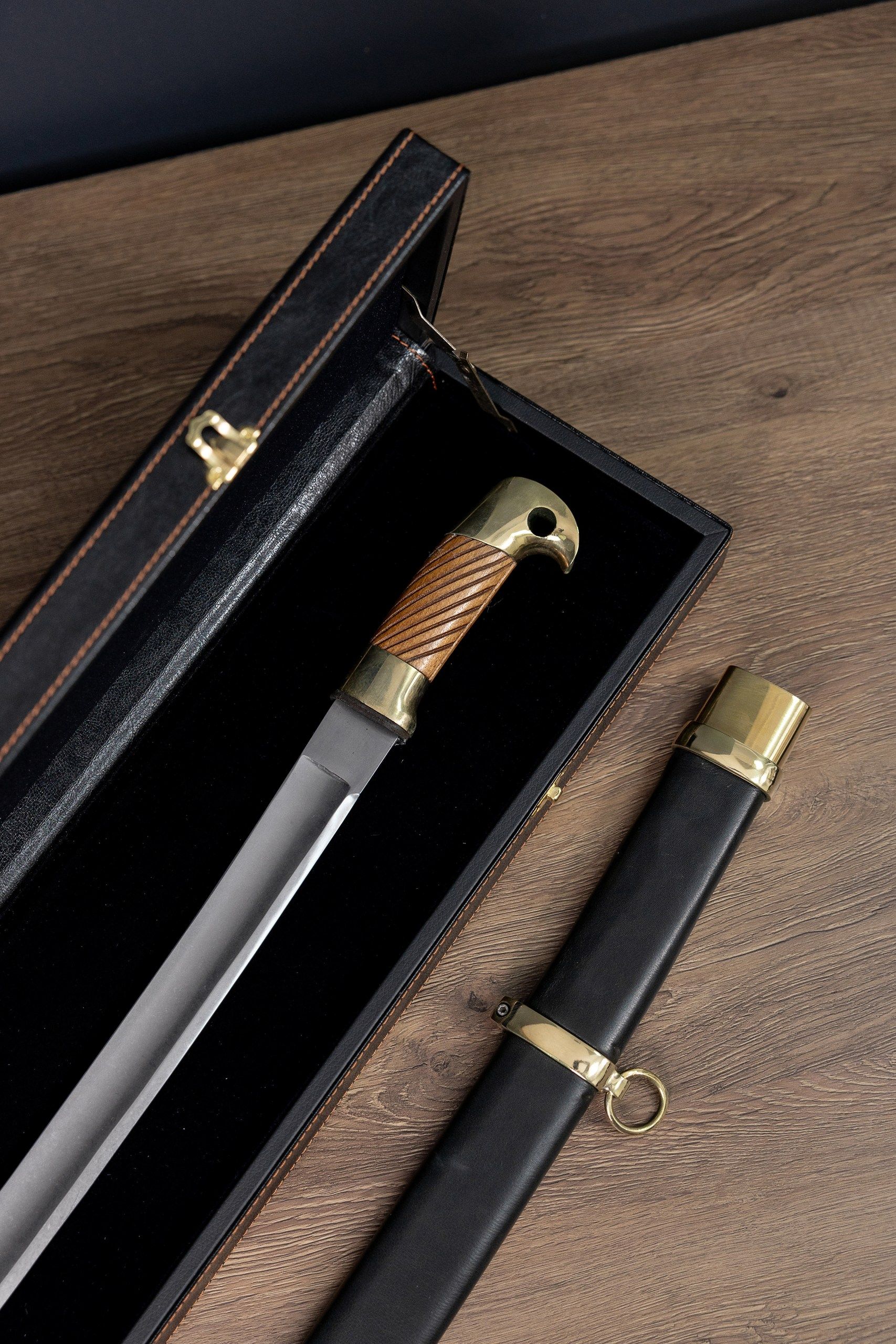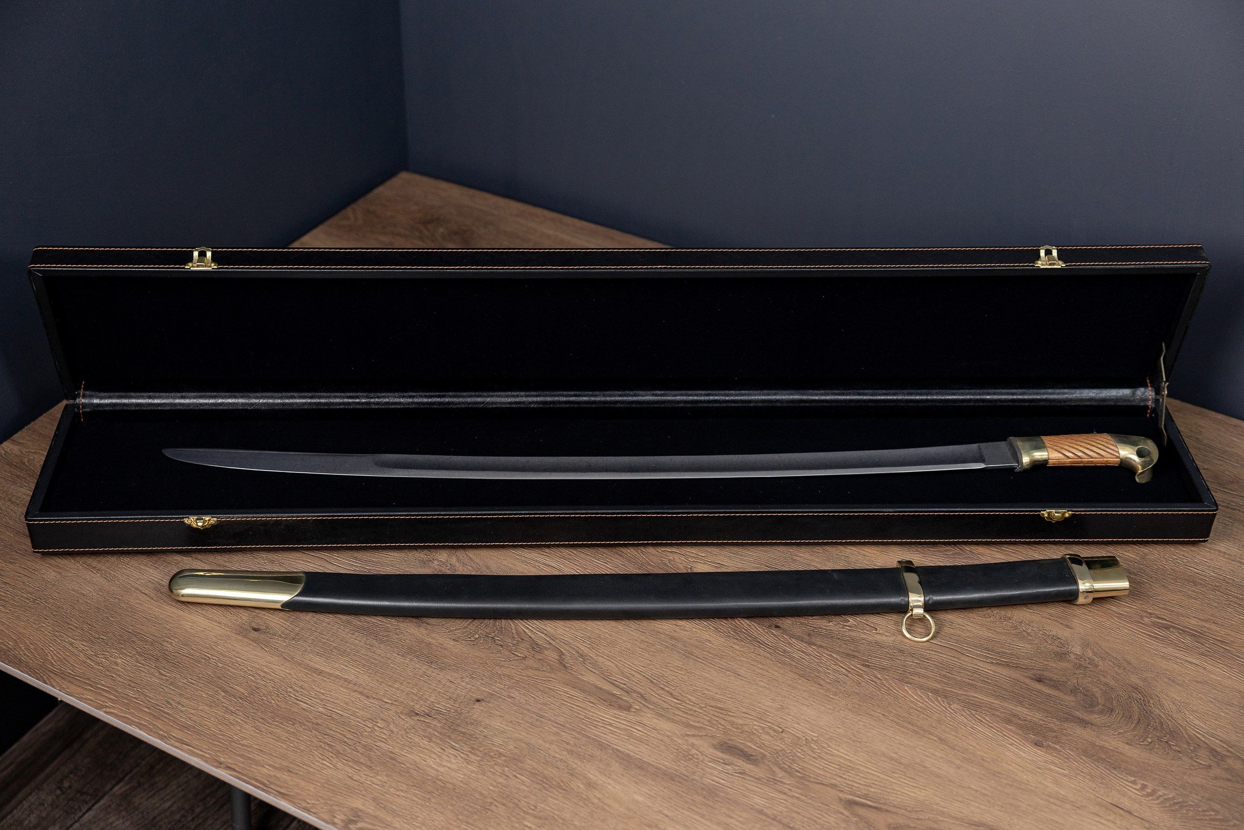 Хвостовик клинка, проходящий через всю рукоять, является цельнокованым и закрепляется снаружи гайкой. Рукоять выполнена из дерева и дополнена латунными приборами. Ножны — также деревянные. Сверху обтянуты натуральной кожей. Имеющиеся на них приборы также выполнены из латуни.