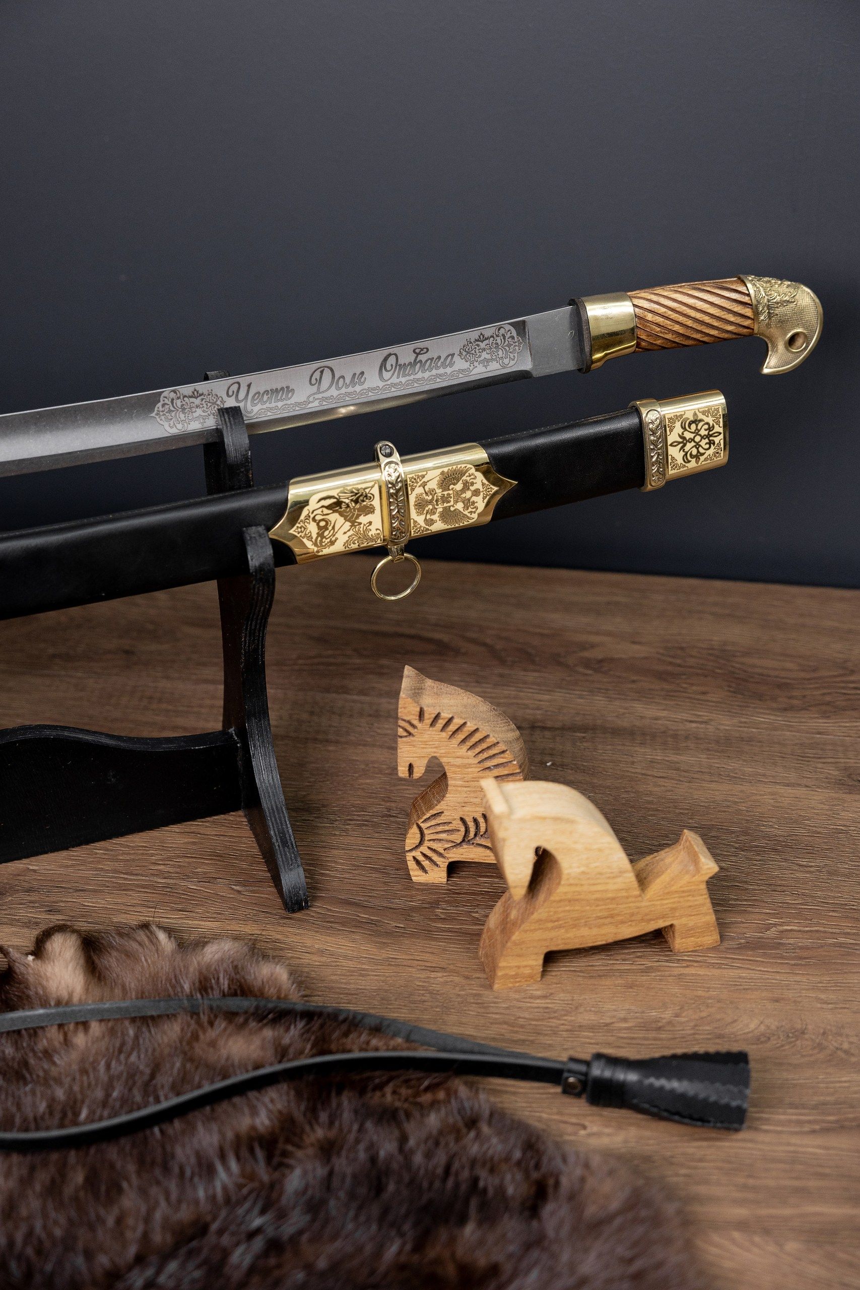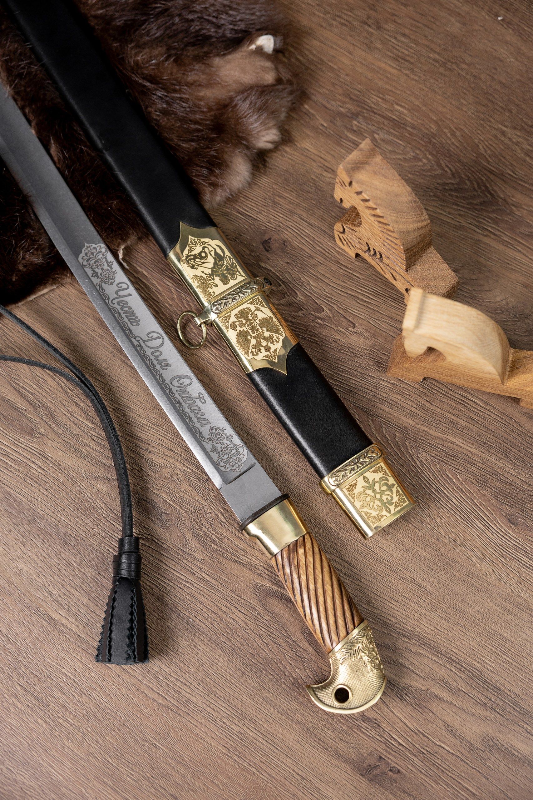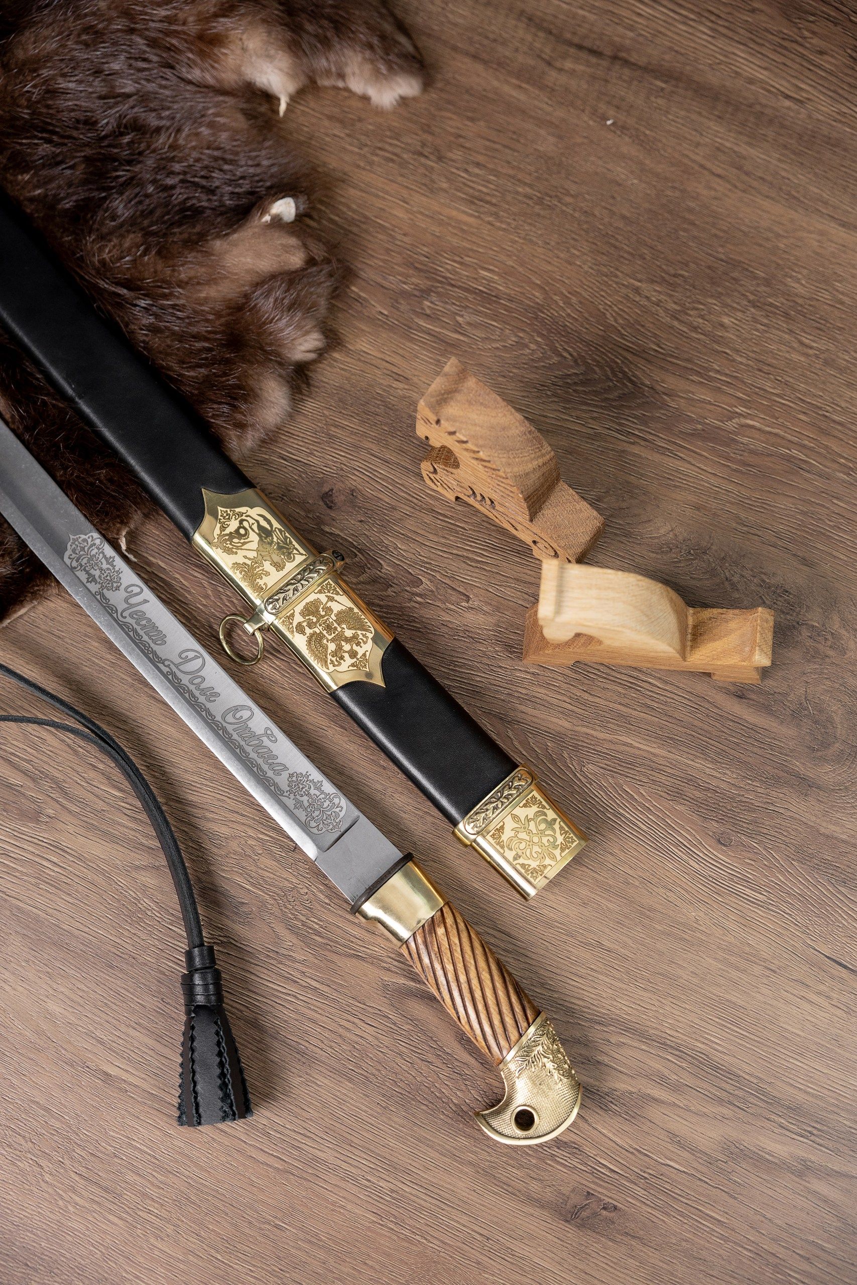 - Ножны из дерева, обтянутые натуральной кожей и дополненные латунным колпаком.