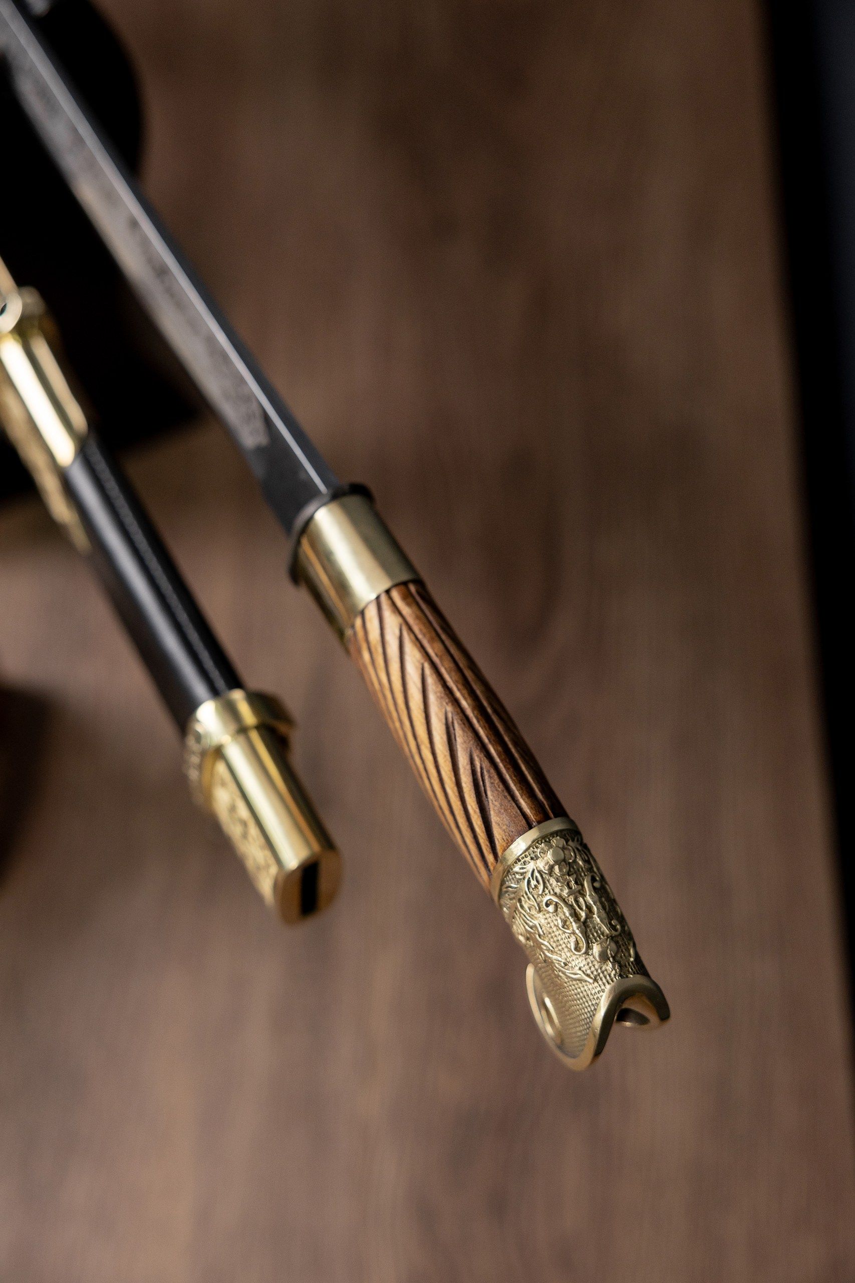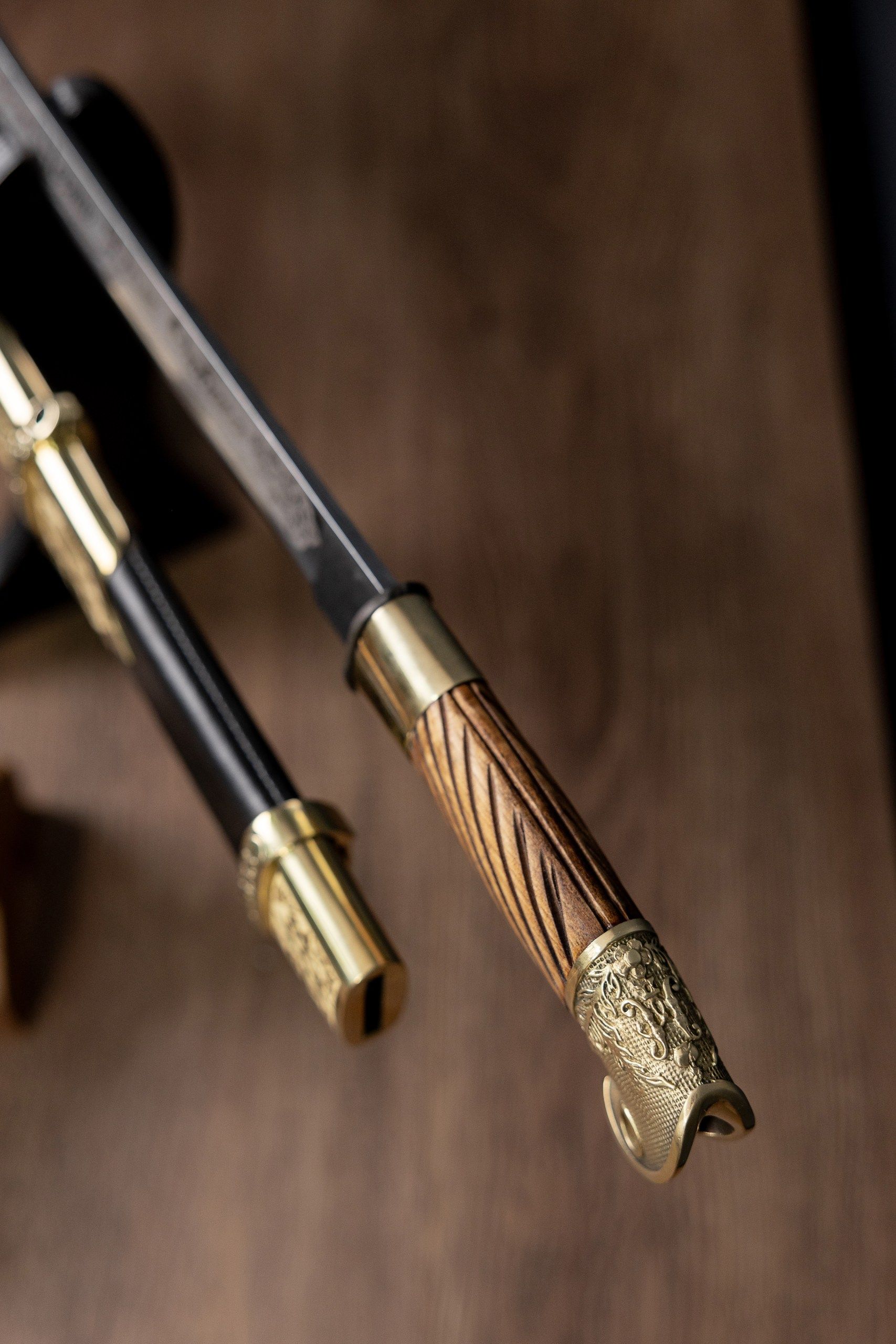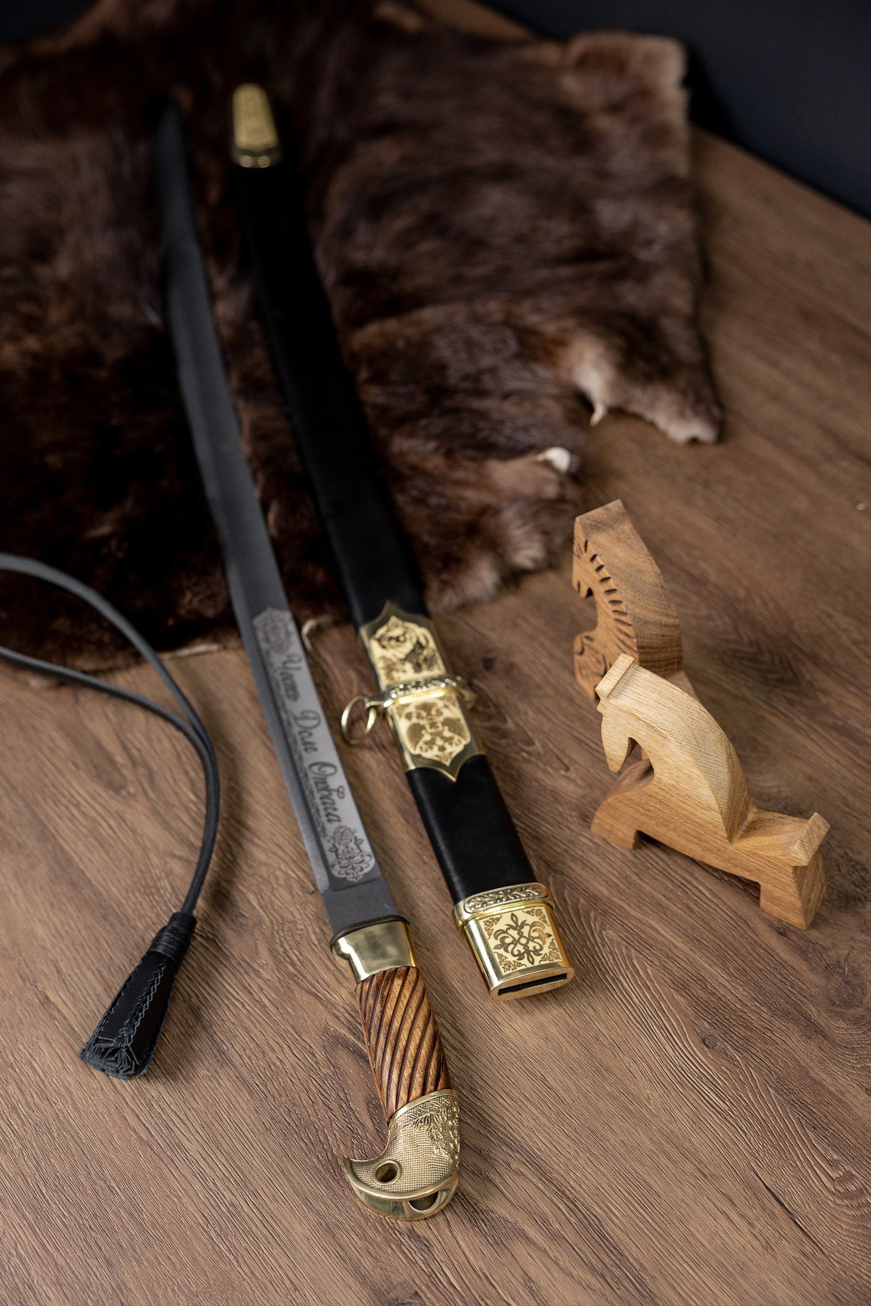 - Ножны из дерева, обтянутые натуральной кожей и дополненные латунным колпаком.