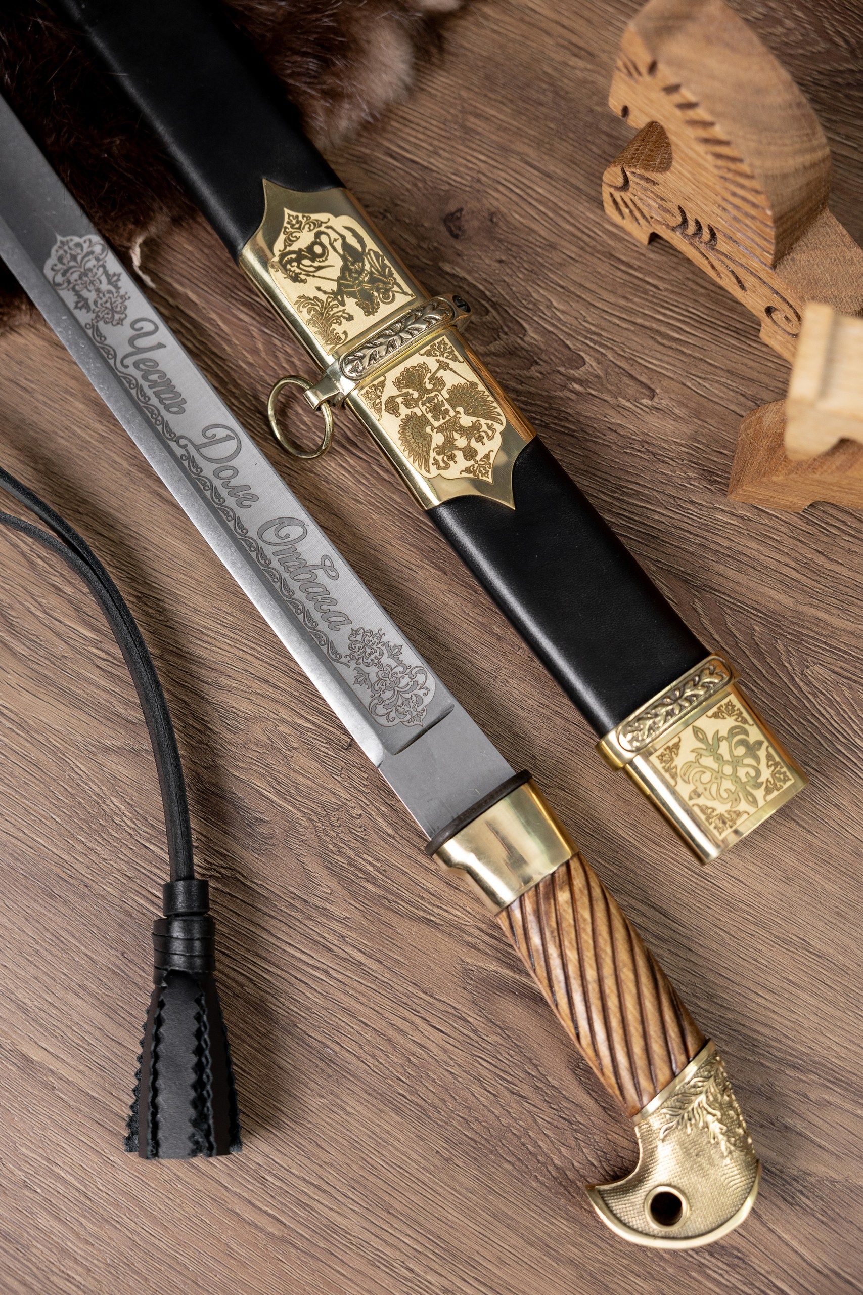 - Декоративный узор и надписи «Честь, Долг, Отвага» и «За Веру и Отечество» по обе стороны клинка;