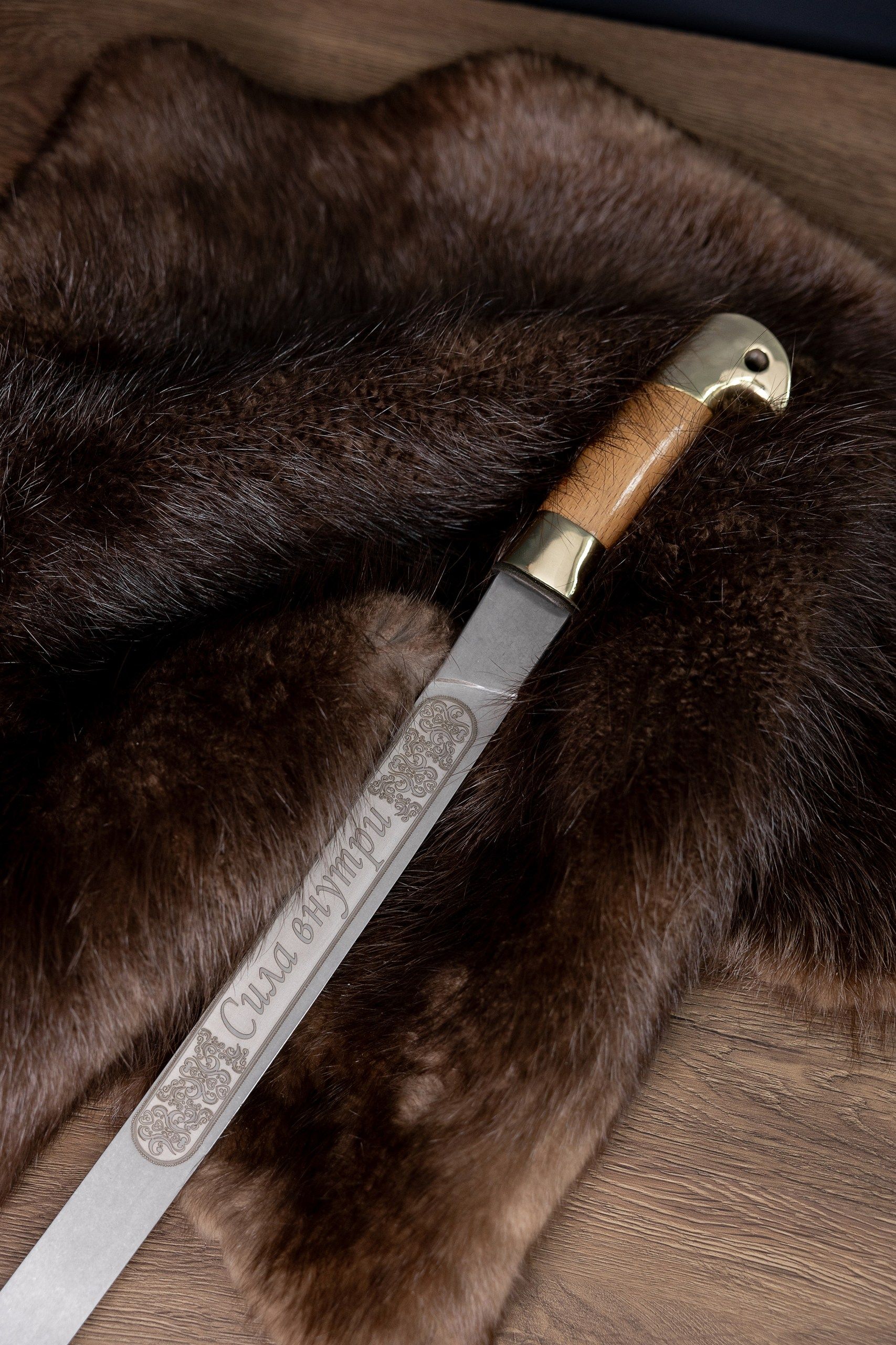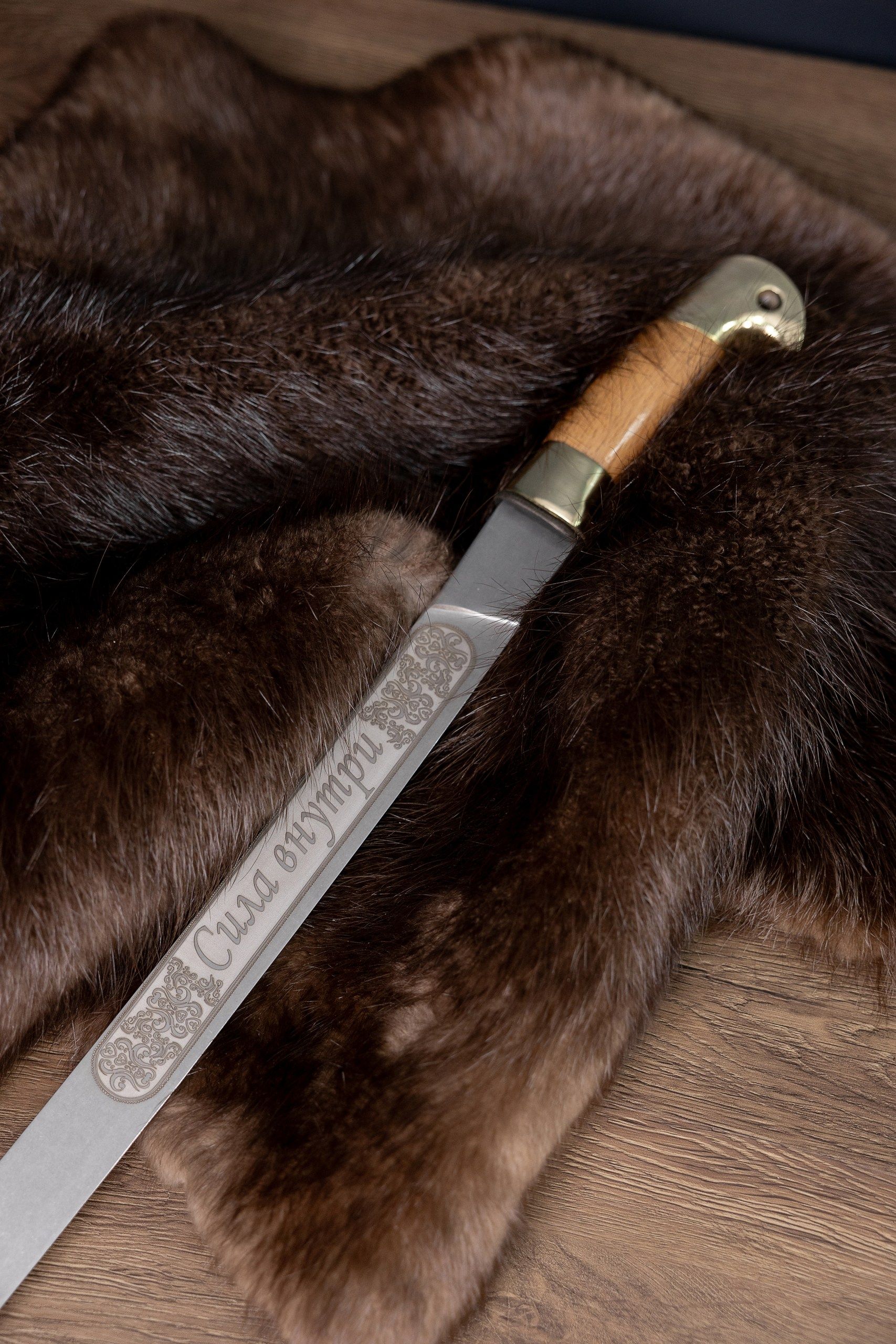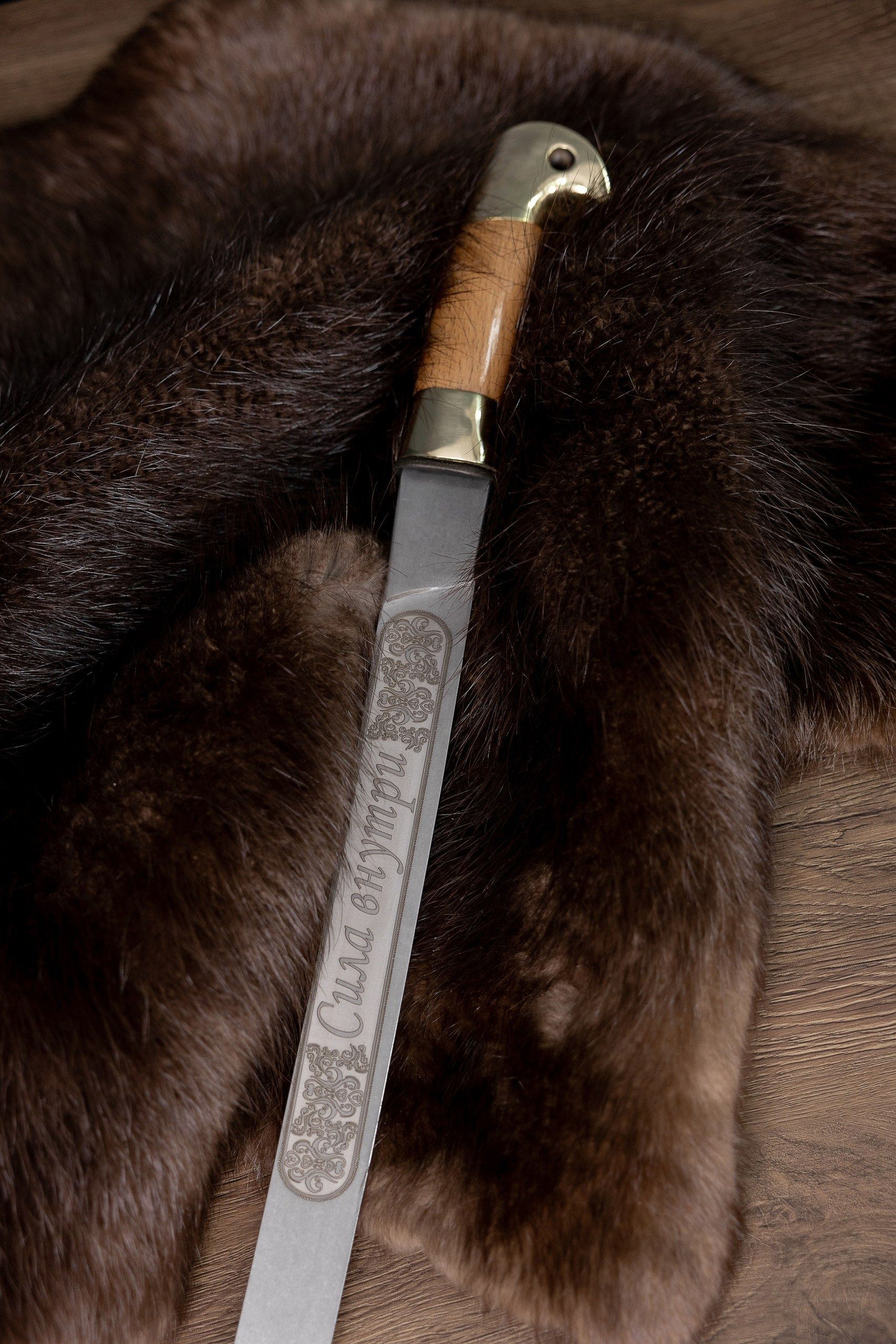 На клинке нанесен узор,а также,надпись. Варианты гравировки: "Сила внутри","Сильная в бою","Честь Долг Отвага","За Веру и Отечество"